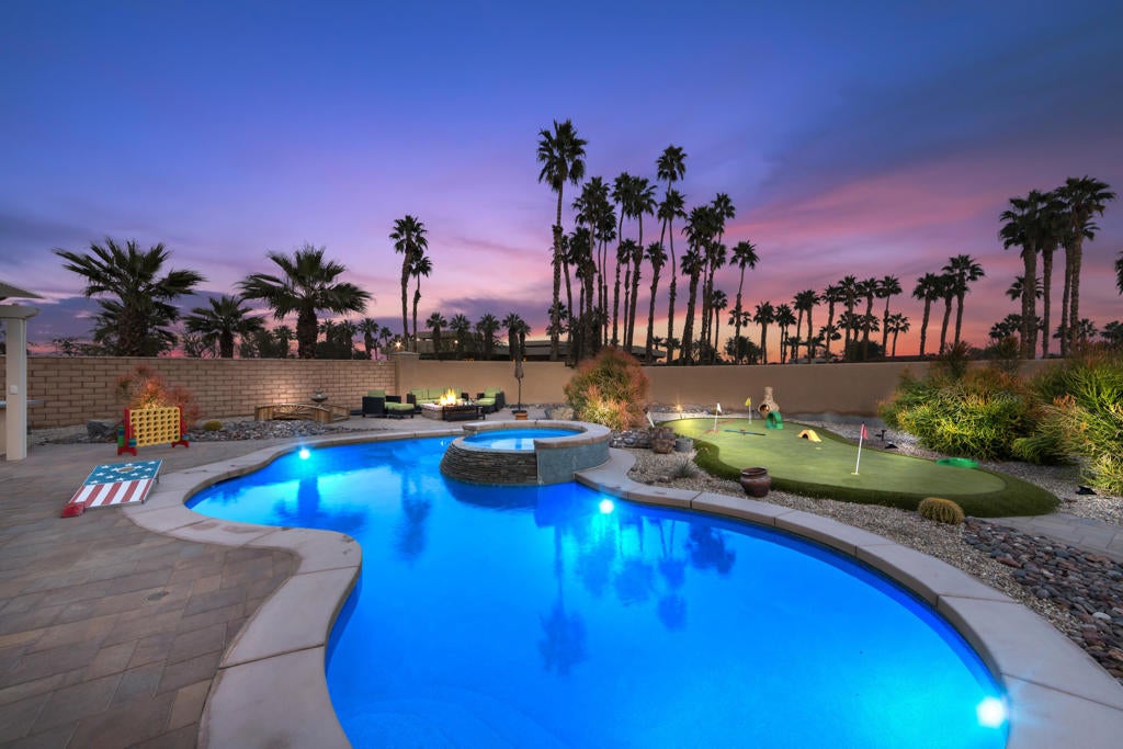 Short term rentals allowed here! Please check with city of La Quinta for STR permits and rules. Incredible home on one of the largest corner VIEW lots in PGA West Signature. Well appointed back yard with custom pool, spa, putting green, fire pit and multiple sitting areas. There's even an enclosed patio with folding doors and fireplace.Multiple floor to ceiling windows bring in lots of natural light. There's a large living room with fireplace that opens to the custom styled kitchen with stainless steel appliances, large center island, rich wood cabinets and granite countertops. There are 3 bedrooms and 3.5 baths that make this the perfect retreat for family, friends, or renters. Conveniently located downstairs are two of the larger bedroom suites with full bath. The upstairs bedroom suite can accomodate 4 people and also has its own bathroom. 2 Car garage plus a golf cart bay is a bonus too!The community offers a fitness center, clubhouse, pool, spa and of course world class golf. Sold turnkey furnished per inventory.Seller motivated.