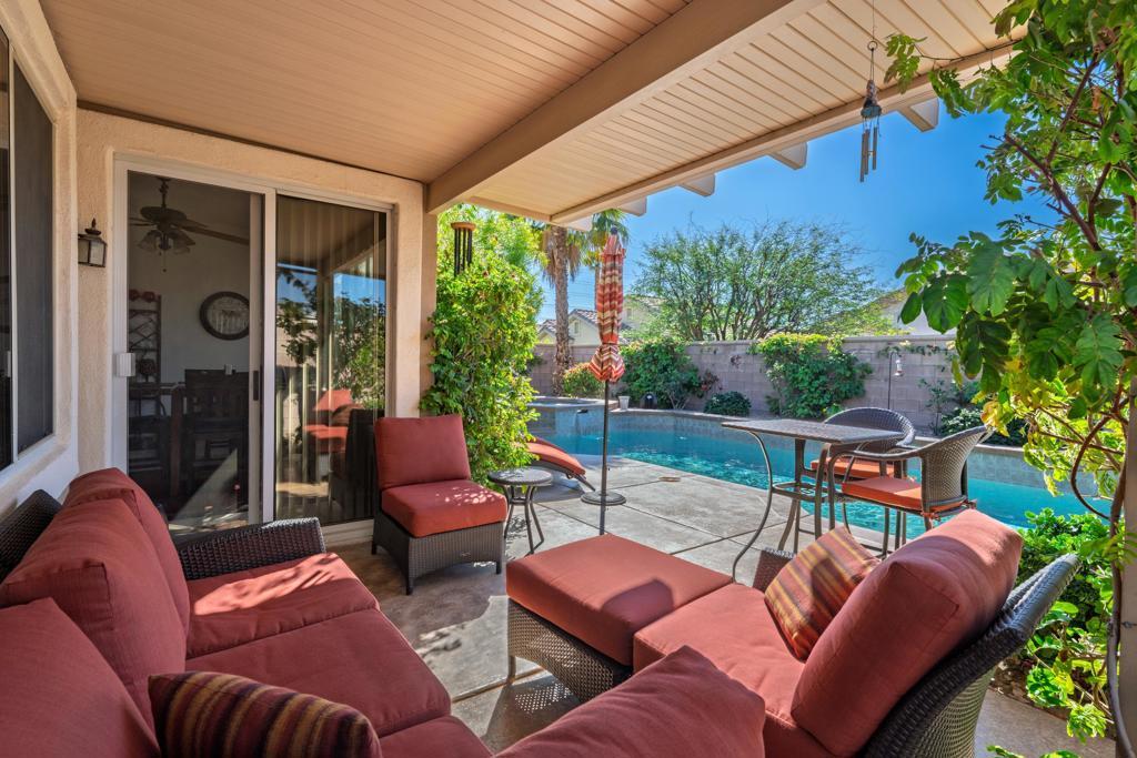 Sun City Palm Desert - Barbados. This seasonally used home is in mint condition. The south facing rear yard showcases a sparkling pebbletec pool and spa (recently remodeled and upgraded) surrounded by a spacious decorative concrete patio with multiple sitting areas providing peekaboo views of the mountains. Lush landscaping creates secluded patio on the north side of the home. Available turnkey furnished! Inside, tile flooring is used extensively. The kitchen features slab granite counters, a breakfast bar, and stainless appliances including an electric cooktop (also plumbed for gas). Light maple cabinetry is in the kitchen and bathrooms. The primary suite has a large walk-in closet and upgraded carpeting. The primary suite bathroom has a stall shower and sitting vanity with cultured marble counter. The guest bathroom has a shower/tub. The guest bedroom has a closet with mirrored wardobe doors. The laundry room has built-in cabinetry. The extended 2-car garage has built-in storage and room to park golf cart tandem.