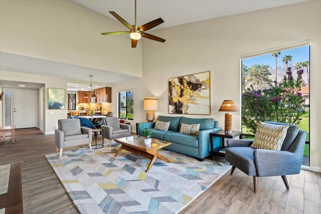 Discover desert living at its finest in this completely renovated 2-bed/2-bath condo nestled on an interior lot within the gated resort community of Sunrise Racquet Club. Boasting 1252 square feet, this end unit dazzles with amazing Mountain views from every room. Natural light floods through three sides of the residence, illuminating porcelain tile flooring throughout. The kitchen is a culinary dream with quartz counters, a glass tile backsplash, and stainless appliances featuring gas cooking. Entertain effortlessly in the gated private courtyard or relax in the serene rear patio. The Primary BR showcases vaulted ceilings and a meticulously renovated en-suite bath w/ double vanities, a spacious walk-in tile shower, natural light and great storage. Additional highlights include a versatile guest BR with an office nook, newer HVAC and water heater, and an upgraded electrical panel. Enjoy resort-style amenities, including 6 pools/spas, tennis, pickleball, and racquetball courts, plus a clubhouse set amidst lush, manicured grounds. Located minutes from downtown Palm Springs, this property offers the perfect blend of luxury and convenience, whether as a primary residence, secondary getaway, or investment opportunity with min 14-day rentals allowed.