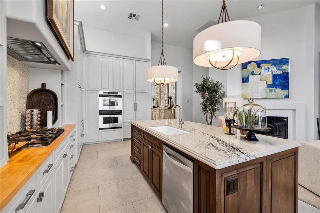 Welcome to Rancho La Quinta, one of La Quinta's premier golf, tennis, and lifestyle communities. This exceptional Encanto II floor plan has been meticulously customized to expand over 3,200 sq. ft. The main home boasts 3 spacious bedrooms, each with an ensuite bath, and 3.5 baths, complemented by a 2-bedroom, 1-bath casita. Enter through a gated and pavered courtyard to discover a European-inspired haven, adorned with new large format porcelain tiles throughout all living areas and baths. The fully remodeled kitchen is a chef's dream, featuring new cabinetry, a custom range hood, high-end appliances, and a blend of marble and butcher block counters. The primary bedroom offers recently completed built-ins and an updated bath with a freestanding tub and custom shower enclosure, creating a serene retreat. All bedrooms open to the outdoors with elegant French doors, inviting in natural light and fresh air. The property also includes an oversized 2-car garage, a large laundry room with ample storage, and a 2-room casita with a Jack and Jill bath and built-in kitchenette. Enjoy breathtaking southwest views from the great room and rear patio, overlooking the 1st fairway of the Pate Course. The outdoor space is a true oasis, featuring numerous fruit trees, a pool spa, and a large built-in fire pit, ideal for entertaining or relaxing under the stars. Offered turnkey with designer furniture, accessories, and art, this one-of-a-kind property is perfect for the most discerning buyers. Experience the epitome of luxury living at Rancho La Quinta.