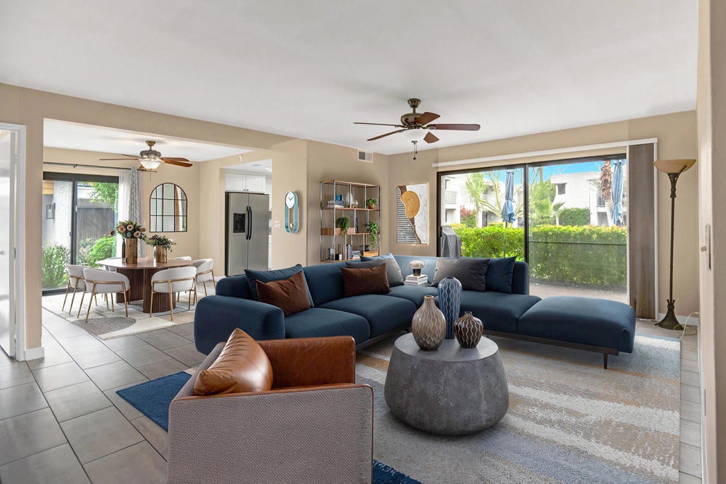 This updated 3-bedroom, 2-bath condo--situated on fee land in the heart of Palm Springs' Little Beverly Hills neighborhood--offers modern upgrades and a prime location. Renovated in 2021, this home features a remodeled kitchen with new countertops, cabinets, and pantry. Newer tile flooring runs throughout the unit, creating a fresh and cohesive look. Both bathrooms have been remodeled and include upgraded countertops and Toto toilets. Ceiling fans have been installed in all three bedrooms, the living room, and the dining area for added comfort. Double-pane windows and sliding doors enhance energy efficiency, and the newer energy-efficient AC ensures optimal cooling during the warm desert months.Located in The Palms--a beautiful, well-maintained community--this unit offers convenient, central access to shopping, dining, PSP airport, and all that Palm Springs has to offer. Whether you're looking for a full-time residence, vacation home, or investment property, this move-in-ready condo on fee land is a fantastic opportunity.**Photo with furniture is virtually staged.**