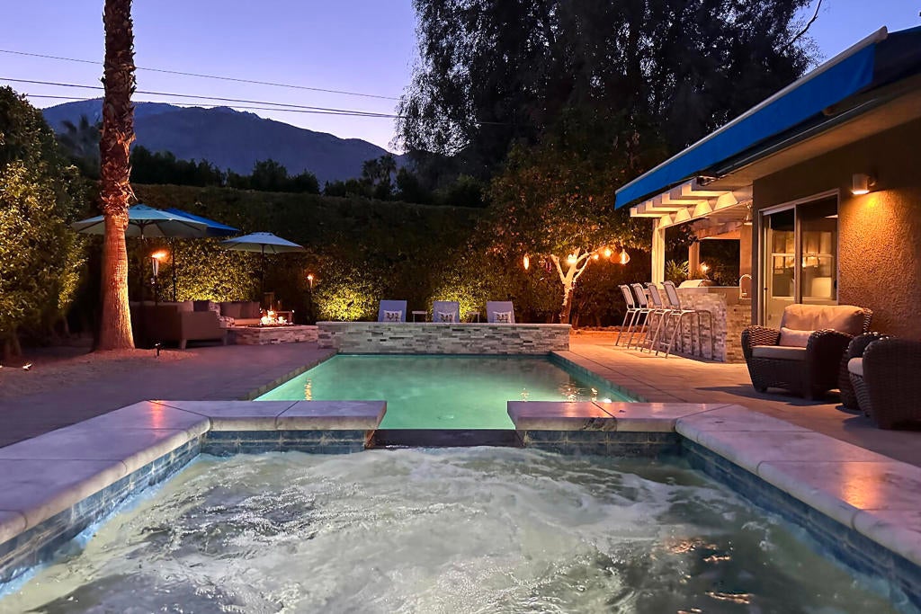 This stunning 4-bedroom, 3-bath home in Dunes Court, a rare gated community in south Palm Springs, offers breathtaking mountain views from the largest lot in its 12-home cul-de-sac. The expansive yard features multiple seating areas, fire pit, a pool with spa and spillways, a trellis-covered dining patio, and a full outdoor kitchen with a gas grill, sink, bar fridge, and dining bar.Inside, the open-concept living space boasts soaring ceilings with clerestory windows, a modern electric fireplace with gorgeous Italian tile accent wall, and an inviting dining area. The fabulously remodeled kitchen has a dine-in counter, professional-grade appliances, a built-in Bosch refrigerator with cabinet front, wine refrigerator, and even a coffee station cabinet.The primary bedroom suite, located down a private gallery hallway, features a designer ensuite bath with a double vanity, walk-in closet, and designer tile work. Two additional bedrooms are down the hall as is a stylish hall bath. One bedroom offers backyard and pool access, and the other opens to a private side yard patio.The fourth bedroom is a detached casita, located just off the kitchen and attached to the back side of the two-car garage. This guest suite features sliding glass doors, a private bath, and direct access to the pool and the outdoor shower--be careful, your guest may never leave.Additional Items and Amenities: Bathrooms remodeled completed 2016, included plumbing Kitchen remodel in 2020 included updating the plumbing Commercial grade misting system installed in 2020 Hot water heater for main home installed 2019 Casita bath remodeled in 2018 Pool and spa were updated in 2017, which included the addition of the outdoor kitchenHOA | $403/month includes maintenance of the common road, gate, common landscaping and lighting, and front yards