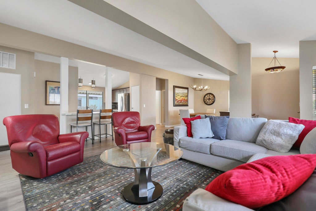 Come get your first look this Saturday, March 22nd from 11-2pm. Beautifully remodeled home in the sought-after Coronado Gardens (55+) where you own the land! This spacious home has been completely updated, featuring new drywall, modern vinyl flooring, and stylish bathroom tile. The vaulted ceilings in the living areas and all three bedrooms create an airy, open feel. The brand-new kitchen highlights the open floor plan, making it the perfect space for cooking and entertaining. The primary suite has been thoughtfully updated and includes a luxury-sized bathroom with a large shower, soaking tub, and updated lighting. A second bedroom is on the opposite side of the home, offering privacy with its own patio access. Step outside to your secluded backyard, which is fully fenced and ideal for a small dog! Enjoy the covered patio for relaxing or gathering with friends. Additional features include a spacious indoor laundry room. This friendly community offers walking trails, a pool, a spa, a gym, billiards room, pickleball and clubhouse activities. It also has low HOA fees and IID electric rates. This perfect setup is for comfortable, easy living with no land lease or space rent