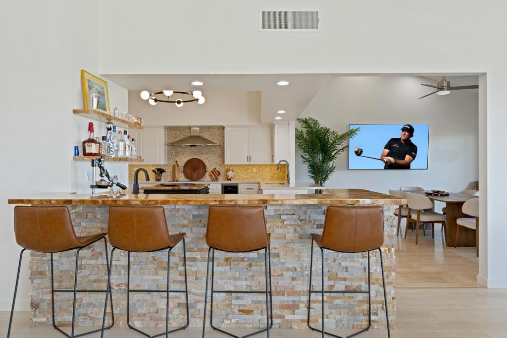 MOVE IN READY. Experience the pinnacle of luxury in this fully remodeled Legends 40 residence, offering 3, 031 sq. ft., 3 bedrooms, and 3.5 bathrooms in the prestigious PGA West community. Situated on an oversized lot with breathtaking mountain views and overlooking the Stadium Golf Course, this exceptional home also provides ample space for a private pool in the side yard. Step inside through an elegant atrium entryway, featuring a stacked accent wall and tiled flooring. The spacious great room is designed for entertaining, boasting a sit-down bar and a stacked stone fireplace mantle. Every detail has been thoughtfully upgraded, with brand-new flooring, fresh interior paint, and all-new recessed lighting throughout. Modern LED ceiling fixtures illuminate the living room, foyer, and breakfast nook, while LED under-cabinet lighting enhances the kitchen and office space. Designed for the ultimate desert oasis lifestyle, the front lawn features artificial turf and a 4-hole putting green complete with sand traps. Paver walkways lead through the side yard and backyard patio to a built-in BBQ area, perfect for outdoor gatherings. The chef's dream kitchen is a masterpiece of style and functionality, showcasing new countertops, an onyx backsplash, stainless steel appliances, and roll-out shelf conversions. The primary suite offers a spa-inspired retreat, featuring custom California Closets, a built-in home safe, and a designer bath with floating vanities, a modern soaking tub, and a private water closet. Additional upgrades include new paint and flooring, a custom cast iron door and gates, solar screens on patio sliders for energy efficiency, The both garages have custom cabinetry and epoxy floors. The home is also equipped with 2 newer A/C units and 2 newer water heaters for optimal comfort and efficiency. Offered furnished per inventory, this exceptional residence embodies luxury desert living at its finest. If you can touch it, it's new! Don't miss this rare opportunity to own a stunning home in the heart of PGA West!