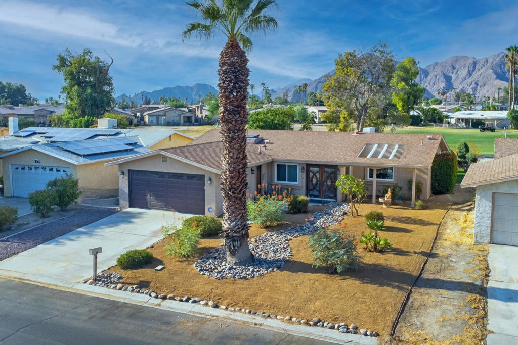**NEW PRICE IMPROVEMENT** Welcome to your dream home! This exquisite three-bedroom, two-bath residence has been completely remodeled, offering over 1,400 square feet of luxurious living space. Step inside to find new carpets, travertine tile and a stunning kitchen, featuring custom cherry cabinets with dovetail soft-close drawers and slide-out shelves. The level four granite countertop with a breakfast bar seamlessly transitions to the dining area, perfect for entertaining. Enjoy top-of-the-line KitchenAid appliances and a Viking range hood set in a striking stack stone surround. The living room boasts a cozy stack stone fireplace, while dual-paned etched and argon-filled windows and sliders provide energy efficiency and sound insulation. Stay comfortable year-round with the newer Train AC system and enjoy the benefits of a GE soft water filtration system. Indulge in the spa jet tub set in a rain glass bay window with a natural river rock floor, or retreat to the master suite's luxurious quartzite shower stall and flooring, creating a spa-like atmosphere. Outside, the desert landscaping features artificial turf, mature plantings, and lemon and grapefruit trees, all perfectly situated on a south-facing fairway golf course location. Relax in the hot tub and take in the panoramic Santa Rosa mountain views. The home is adorned with custom sconces around the curved glass double entry doors and has no HOA fees. This property must be seen to fully appreciate its extensive upgrades and serene, spa-