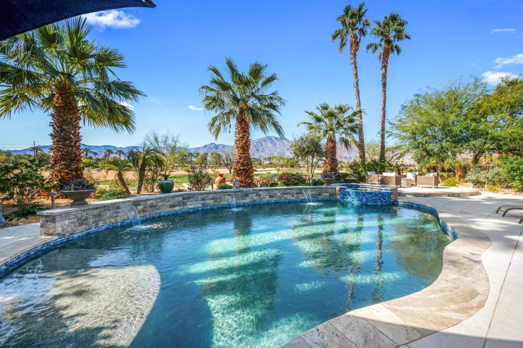 Spectacular PGA Greg Norman Home!!! Enjoy the most desired south facing views of the Santa Rosa Mountains and the 14th & 7th fairways! Indulge in this gorgeous outdoor pebble tec pool & spa surrounded by a travertine paver patio. Wait till you see the carefully thought-out upgrades within this entire home, custom kitchen cabinetry with luxurious matching built ins that tie into the living room and office space. Beautifully chosen granite countertops overlooked by uniquely designed chandelier lighting! High end appliances throughout - Jenn Air gas stovetop & custom built in fridge! Primary retreat offering a cozy space to relax with privacy, flat screen tv and comfortable seating areas. The primary ensuite includes a soaking tub, walk in shower and dual vanities! 2 Guest bedrooms all arranged with comfortable furnishings, privacy, and each have their own ensuite! Not to mention a quaint formal living room that's warmed by the fireplace, the den acting as a mix use room for tv watching, light office use, or a workout space. Back to the outdoor living area arranged with newly installed automatic awning and misting system! There is multiple seating areas for maximum entertaining! Included by a 6-person fire bar top, custom outdoor kitchen & multiple fruit trees! There is a 3-car garage with mini split! This home literally will blow your expectations away! Are you social and love the outdoors? There is opportunity to enjoy golf, tennis, pickleball, biking, so many dining options within the La Quinta area, not to mention there is golf and social membership options within the PGA community.