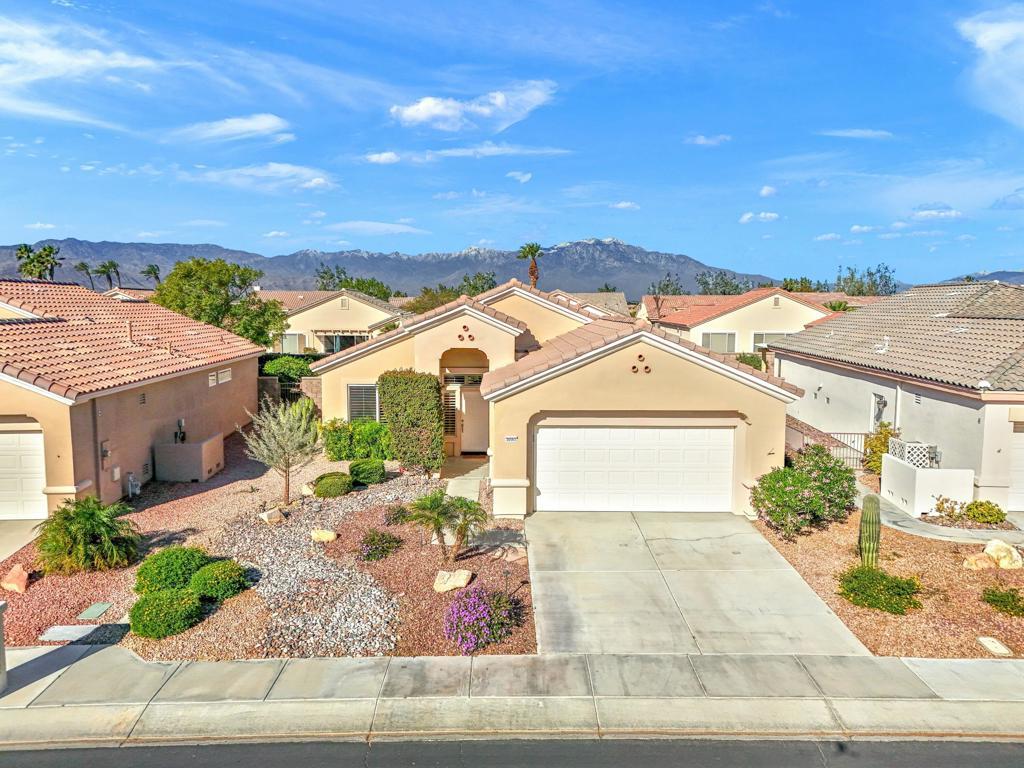 Welcome to Del Webb's 55+ Sun City Palm Desert--The ''Best Bang for your Buck'' active retirement community in the desert! This fabulous charming great room Caymen model is centrally located close to the Sunset View clubhouse. The home has 2 bedrooms, 2 baths, plus a spacious DEN/OFFICE, plantation shutters t/o, freshly painted, new 10X36 porcelain tile, bright sunny foyer with high ceilings and transom windows. The great room is open to the kitchen with view and slider to the patio. The kitchen boasts slab granite counters, maple cabinets, s/s gas range, newer fridge, new faucet, breakfast bar and kitchen nook. The master suite has a great view to the backyard, carpet, bath has double vanity and walk in closet. Guest bedroom has large closet and bath has a soaking tub. The den/office/dining room has double bi-fold doors and is located off the entry with access to the kitchen. The indoor laundry room has built-in cabinets and washer and dryer are included. Garage has full wall of storage cabinets. The spacious and serene private rear yard is extended with Alumawood awning which creates a perfect area for relaxing and entertaining. The beautiful low maintenance desert and tropical landscaping surrounds the yard along with an high wall for extra privacy. Don't miss this perfectly maintained in pristine condition, it will not last long! Low HOA dues at 473.00/mo plus Spectrum cable/internet for only 43.00/mo. Buy Where you Love to Play....Sun City Palm Desert .''