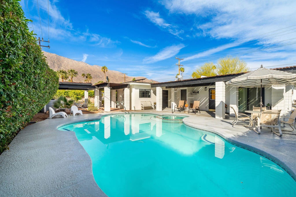 *Fixer Alert* Great bones in a great location with recent sold comps $400k+ higher. Substantial work has already been completed with a beautifully remodeled kitchen featuring sleek quartz countertops and premium stainless steel appliances. Generous windows bathe the interior with abundant ambient light and accentuate sandblasted natural wood ceilings. Neutral tile flooring and a wide hallway leads to generously-sized bedrooms, punctuated with beautifully finished natural wood doors. Enjoy year-round energy efficiency with OWNED solar panels, reducing your carbon footprint and utility bills. The fully walled ultra private backyard features mature hedges, pool, spa, covered patio and western mountain views! Located in the desirable South Palm Springs neighborhood of Tahquitz River Estates, you're just minutes from world-class dining, shopping, and entertainment. Sweat equity awaits and this one is priced to SELL, so you can add your own creative touches. No HOA, you OWN the land, and short term rental permits are still available in this neighborhood. Schedule your private tour today!