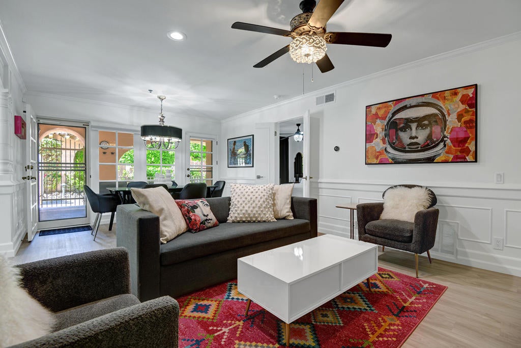 This fully remodeled 2-bedroom, 2-bath condo in the gated Palm Springs Deauville community is move-in ready and sold furnished (with a few personal exceptions). The single-level layout includes two primary suites, each with built-in cabinetry and updated bathrooms. The spacious living and dining area opens to an oversized covered patio, while a second patio extends from the secondary suite.The remodeled kitchen features quartz countertops, white Shaker cabinetry, a pantry, an induction cooktop, and stainless steel KitchenAid appliances, plus a casual breakfast area and dining bar. Additional upgrades include luxury vinyl plank flooring, crown molding, wainscoting, LED lighting, and smart-controlled security. The main suite also includes a laundry space with a full-size stacked washer and dryer.This sought-after Hugh Kaptur corner unit offers west-facing mountain views and easy access to subterranean parking. You can also take advantage of the three gorgeous pools and spas. With a strong rental history and HOA approval for short-term rentals (14-day minimum), this property is an excellent investment opportunity or a stylish Palm Springs getaway.