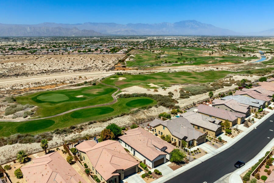 Golf View Home... Four Seasons at Terra Lago! Popular Indio Hills Model, You'll Love the South facing views of Santa Rosa Mountains, San Jacinto, City Lights, & Golf Panoramic Views! Spacious & Inviting floor plan offers 9 ft Ceilings, Ceramic Tile ,Carpet in 2 bedrooms & Den/Office, 10 ft Ceilings! Primary Bedroom is King Sized ,w/Bay Window Upgrade, Ceiling Fan. Primary bath w/separate tub & shower, dual sink vanity, window for natural light. Large Walk in Closet. Guest bedroom is Queen Sized w/bath adjacent... You'll appreciated the separation from Primary Bedroom for Maximum Privacy. Large Den/Office off entry Hallway. Beautiful Cooks Kitchen with Stainless Steel Appliances, Refrigerator Included! Granite Breakfast Bar, Lots of Cabinetry for storage, Walk in Pantry! Laundry Room with Countertop & Cabinetry. Low maintenance yard w/covered Patio, Premium Location, Room to Build a Pool/spa. 3 car (tandem) garage! The Lodge is located nearby for Social Activities/Clubs! Beautiful Outdoor Resort Style Pool, Spa, Cabanas, BBQ, Firepit area for community events! Indoor Pool for laps, water aerobics. Beauty Salon, Fitness Center, Billiard Room, Banquet Room, Craft Room, Library. Tennis, Pickle ball, basketball, Putting Green, Bocce, shuffleboard, horseshoes! Golf Club at Terra Lago meanders thru this community, however it's not owned by the development... Enjoy the Savings of lower HOA dues. You'll Love the Four Seasons at Terra Lago Lifestyle!