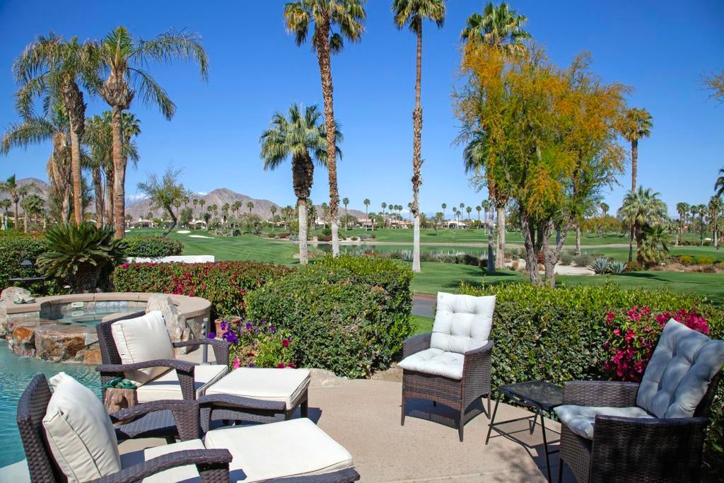 Fantastic Encanto 2 with detached stand-alone 2-room guest house and massive entry courtyard with fountain! Presiding over quadruple fairway and lake views of the Jerry Pate Course, this home is an end-unit location with no neighbor on the right. Offered by the original owners who bought it from the developer, this home features travertine flooring in the main living areas, plantation shutters and massive Fleetwood slider and large windows that capture views of the rear grounds, tranquil pool, and golf course beyond. The fireplace surrounds in both the living room and family room offer a scale that complements the voluminous ceiling height. Most buyers of this plan are remodeling the built-in media center in the family room and opting for a long console table with floating flatscreen tv on the wall - In this instance, the wall is ready to go with zero demolition saving the buyer time and money. The chef's kitchen features rich granite counters, stainless steel appliances and an upgraded Frigidaire gas cooktop. The main bedroom suite opens directly to the pool and spa and offers fairway and lake views. Additional features include: exterior of home painted in 2024; salt water pool; replaced front door and casita door entry in 2019; waterline at pool replaced in 2015; variable speed pool pump replaced in 2023; phantom screen at front door in 2019; oversized lot offers a spacious sideyard complete with citrus orchard and walking path; cool deck concrete treatment at poolside patio area and more!! This is a rare mini-estate opportunity within Rancho La Quinta and the detached guesthouse provides a courtyard entry atmosphere that is rarely seen in this plan for this price. For buyers looking to re-envision an Encanto 2 with their own colors and hard surfaces, this home and location offers all of the raw elements to create your very own Rancho La Quinta estate. What's more, the pool area features a raised seating area adjacent to the spa that is the ideal location for friends and entertaining - all before a backdrop of a large lake, multiple fairways and snowcapped Santa Rosa, San Jacinto and San Gorgonio mountains in the distance.
