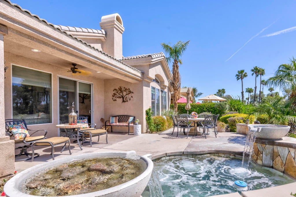 VIEWS,VIEWS,VIEWS If you are looking for a home with Spectacular views, then look no longer. Not only do you have a Magnificent View of the mountains and the golf course, you also have a stunning serene view of your own (Retreat) the Spool, heated with waterfall and lighting. Featuring a Saint Andrew's model home on the golf course overlooking the 6th and 7th green of the Cielo Course. Sit on your spacious patio and look at the BEAUTIFUL MOUNTAINS and LAKES. This 3-bedroom 2.25 bath home features an open floor plan with natural lighting illuminating throughout the home. The Kitchen features granite countertops, a center island. The gorgeous back-splash is a perfect match for the granite countertops., also featuring a newer stainless-steel refrigerator. In addition to three spacious bedrooms there is a small convenient office. The Desert Princess offers a 27-hole PGA championship golf course, beautifully maintained open year-round (except for overseeding). Member golf rates are some of the lowest in the valley. HOA includes social membership to the very active golf club, and cable internet including HBO and Showtime. Features 34 swimming pools and spas. Some of the amenities include bocce ball and 12 pickleball courts, EV charging station, tennis courts, and fitness center. Desert Princess Country Club is conveniently located just minutes away from Palm Springs International Airport, Downtown Palm Springs, restaurants, shopping, nightlife and hiking. Several casinos are nearby. Agent-Only Remarks: Be sure to show your buyers the restaurant, and clubhouse, tennis courts, and fitness center. Monthly ground rent is $139.62 per month. Grounds are maintained to your doorstep (you pay only for inside water).