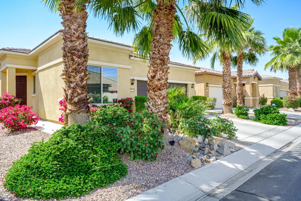 Welcome to this stunning 2-bedroom, 2-bathroom Embark model home, nestled within the highly sought-after 55+ community of Sun City Shadow Hills. A perfect blend of elegance and function, this 1,321 Sq. Ft. residence offers a peaceful retreat with a touch of luxury. The home is framed by low-maintenance desert landscaping, offering beauty without the hassle.Inside, high ceilings, recessed lighting, and beautiful hanging fixtures create an open, airy atmosphere that feels both spacious and private. Signature tile flooring flows seamlessly throughout the home, providing easy upkeep while enhancing the home's timeless design.The kitchen is a true dream--a space where culinary creativity can flourish. A charming breakfast bar with seating invites casual meals and conversation, while the kitchen flows gracefully into the dining room, making it ideal for hosting family gatherings or enjoying quiet dinners.. The large living room, with its inviting warmth, opens to your backyard oasis where you can also enjoy outside dining. A covered Alumawood patio extension, adorned with decorative lights, enhances your outdoor space, providing the perfect setting to entertain or unwind while savoring breathtaking sunsets over the lush, natural landscaping.The master suite offers a tranquil retreat, with large windows that bring in soft natural light. Its bathroom boasts dual vanities, a generous walk-in closet, and a spacious shower stall with a convenient bench for added comfort. A separate laundry room off the garage adds convenience and functionality to your daily routine.Sun City Shadow Hills is more than a home--it's a lifestyle. With world-class amenities including two scenic golf courses, a state-of-the-art fitness center, multiple pools, tennis courts, and a variety of clubs and activities, you'll have everything you need for active, resort-style living.Experience the best of both worlds: serenity and vibrancy, comfort and adventure. This is more than a home--it's the perfect place to live your best life.