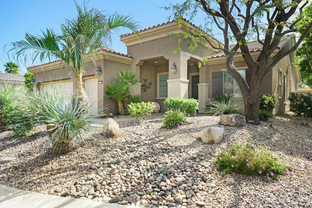 Perched on a spacious corner lot of 7,841 sqft, this stunning Castellano model offers 2,230 sqft of luxurious living space, blending modern design with the natural beauty of the desert. Surrounded by stone, river rock, and desert landscaping, including vibrant trees, palms, and desert perennials, this home creates a peaceful retreat with the charm of the outdoors flowing seamlessly indoors.The kitchen is a chef's dream, featuring a long, wrap-around breakfast bar, a large kitchen island, range top, double stacked ovens, and sleek stainless steel appliances. Perfectly positioned to connect with both the leisure and dining areas, this space is ideal for entertaining guests or enjoying quiet family meals. Throughout the common areas, den, and guest rooms, tile flooring adds elegance, while upgraded ceiling fans with crafted wood blades and brass accents bring comfort and style.The versatile den offers endless possibilities, from a home office to a cozy reading nook. The primary suite is a sanctuary of relaxation, with a carpeted bedroom and an en-suite bathroom featuring a walk-in closet, dual vanity, separate tub, and a spacious shower stall.Enjoy your own backyard oasis, where a large rock waterfall, now blooming as a flower garden, serves as a serene focal point. The patio, complete with recessed lighting and a wide-blade outdoor fan, offers comfort and style, while the Alumawood covering extends over a graceful pathway leading to the side yard. Textured accent pavers enhance the beauty of the front driveway, entryway, side walkway, and back patio, creating a welcoming atmosphere.A new 2024 AC unit ensures year-round comfort, and the 2-car garage, plus golf cart garage, features epoxy flooring, wall-mounted storage cabinets, and an additional work counter for your projects.Inside, the dedicated laundry room provides added counter space and a sink, with an adjacent half bath for convenience.As a resident of Sun City Shadow Hills, you'll enjoy a vibrant 55+ community that offers an array of amenities including two championship golf courses, state-of-the-art fitness centers, swimming pools, and a variety of social clubs and events. With the perfect combination of beauty, functionality, and comfort, this home is a true desert gem.
