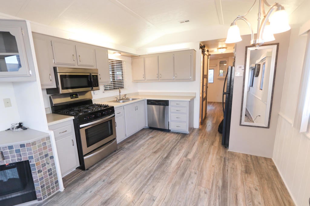 Stunning 1 bedroom unit with an addition for extra comfort. Modern updates including wood-like vinyl flooring, leisure deck, washer and dryer closet with washer and dryer included in the sale. 55 and older gated community, pools / spas, clubhouse, social events monthly, well maintained community, includes water and trash service. HOA is only $228 monthly. The land lease fee is only $94 dollars monthly. Land lease extended to the year 2042.