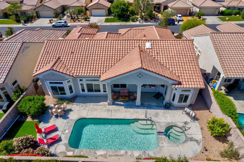 Sun City Palm Desert - Extended Emerald - CONTEMPORARY UPGRADES! LIGHT FILLED! HIGH CEILINGS! POOL/SPA! BEST 55+ COMMUNITY! This 3 Bedroom/3 Bath home has it all! Outstanding curb appeal, fresh exterior paint & pristine landscape with gated courtyard lure you to the 8' double-door entry into this illuminated 2,029 sq ft home. Be immediately WOW'd by the Foyer's 12' double tray ceiling with uplighting & the Living & Dining Room's same soaring ceiling height with a wall of glass that brings the outside in. Neutral-colored 18'' x 36'' tile flooring continues throughout the main living areas with high-efficiency Milgard Low-E windows on all 43 windows, plus window roller shades on major windows. Sizeable Family Room with transom windows is off the chef-inspired Kitchen, which features quartz countertops & backsplash, custom Thermofoil cabinetry, stainless steel appliances, double oven, large island, tons of storage, kitchenette & even a pass-through window to the rear yard. Spacious Primary Bedroom with Italian porcelain plank tile flooring showcases a bay window with views of the attractive backyard plus an extensive walk-in closet with uplighting. Ensuite Bath includes dual vanity, granite countertops, huge walk-in shower with 12'' x 24'' tile & built-in bench. Extended Second Bedroom with transom windows & Ensuite Full Bath with quartz counter is like your own attached casita, which provides comfort & privacy for visitors. Third Bedroom with a closet overlooks the Courtyard & can be used as an Office or Guest Room, plus has an attached full Bath. Laundry Room with included LG washer & dryer has utility sink, plus upper & lower storage cabinets. Perfect for entertaining, the indoor-outdoor living experience flows into the inviting backyard with an extended patio cover, sparkling 27'L x 12'W pool & 7'W spa with recent pebble-tec resurfacing & newer electronic pool equipment with variable flow pump. An added bonus includes a pool cover on wheels, plus spa cover for minimizing debris. 2-Car Garage & Golf Cart Storage has dual-zone American Standard HVAC units, 2-ton A/C split unit, insulated garage doors & openers with camera, water heater recirculating pump & built-in attached storage cabinets. Extra highlights include four 2022 installed Skylights, LED can lights, modern ceiling fans, central vacuum, solar sun screens, plus much more! An entertainer's dream, this magical gem with a plethora of upgrades offers an inviting resort-like lifestyle just for you!
