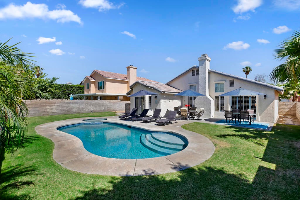 Welcome to the desirable North La Quinta neighborhood of Acacia! Nestled on a tranquil cul-de-sac, this stunning home offers 3 bedrooms, 2 bathrooms, and a dazzling newly resurfaced pool and spa oasis. The expansive south-facing backyard is a true entertainer's dream, boasting ample space for dining, family gatherings, a kids' playground, or simply unwinding in the serene desert ambiance.This property radiates pride of ownership, showcasing elegant details like diagonally-set 18-inch floor tiles, warm wood laminate flooring, Bermuda shutters, and ceiling fans. The vaulted ceilings amplify the airy, open feel, bathing the living and dining areas in abundant natural light. The sunny kitchen and bathrooms have been thoughtfully remodeled, featuring striking granite countertops, stylish backsplashes, and generous storage options.The secluded and inviting primary suite is a personal retreat which features a 10-foot-long closet, vaulted ceiling, and stylish bathroom with double vanity, separate shower, and toilet room, a second & convenient step-in closet and sliding glass doors offering ample natural light that lead directly to the inviting pool and spa. The spacious primary bedroom is a personal retreat, complete with ample closet space and sliding doors that lead directly to the inviting spa.Positioned conveniently close to top-rated International Baccalaureate schools, renowned restaurants, premier shopping destinations, world-class golf courses, and the iconic Indian Wells Tennis Garden, this home is the perfect desert retreat.Enjoy low-cost electricity provided by the Imperial Irrigation District and there are no HOA fees! Make this exceptional property your own in North La Quinta!