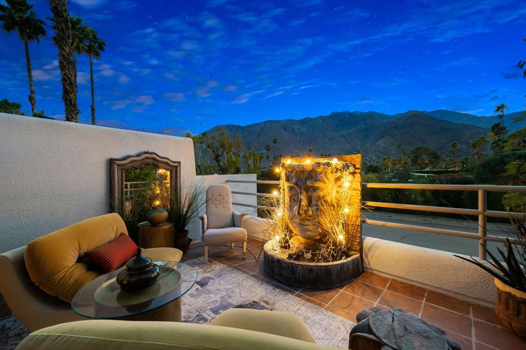 This architectural zen retreat with soaring ceilings is an impeccably renovated 2-bedroom, 3-bath townhome that seamlessly blends timeless design with today's most advanced smart home features. Centrally located just steps from vibrant Downtown Palm Springs, this stunning unit offers privacy, comfort, and mountain views from both the front and back. Inside, you'll find a thoughtful reimagining of every space. Elegant custom arches add architectural charm, while the open concept kitchen showcases calacatta gold marble countertops, custom-built cabinetry, and top of the line appliances for a true chef's experience. The home is fully equipped for modern living with dimmable LED track lighting throughout, all controlled by the Lutron app or wall switches. From lighting and climate control with a new AC/HVAC, to the security system and indoor/outdoor cameras, everything is easily managed right from your phone. The media ready guest bedroom is fully equipped with a professionally installed 120'' theater screen and surround sound system, ideal for movie nights or hosting visitors in style. The serene primary suite boasts a custom closet and a spa-inspired bath. Step outside to your back patio for direct access to the sparkling community pool and spa. Additional upgrades include newer plumbing, a tankless water heater, and luxurious designer wallpaper that adds a bold, sophisticated touch. With only one shared wall, the home is exceptionally quiet and private, bathed in natural light with breathtaking mountain views that bring the serene Palm Springs landscape right into your living space. Located in the quiet Little Tuscany neighborhood within walking distance to shops, restaurants, and all the excitement of downtown, this home truly has it all. Smart, stylish, and move-in ready, this is Palm Springs living at its finest.