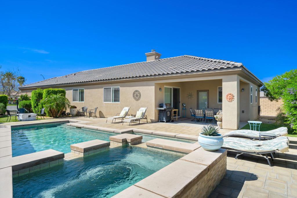 Fully furnished and ready for move-in, this newer upscale home offers enviable short-term-rental opportunities behind the impressive guard-gated entry of Indio's prestigious Indian Palms Country Club and Resort. Just a short stroll from the Empire Polo Club, which is home to the internationally famous Coachella and Stagecoach music festivals, the open-concept single-level residence is settled on a cul-de-sac homesite of almost 8,712 square feet-larger than most in the neighborhood. Colorfully landscaped grounds are extra private, making it easy to enjoy a pool and spa with waterfalls, a shaded loggia, paver-finished patios, a lawn, open-air fireplace and welcoming side entrance. The interior is just as desirable thanks to on-trend decor and appointments. Measuring approximately 1,974 square feet, the light and bright design hosts three bedrooms and three baths, including a secondary ensuite and an oversized bedroom with space for two beds. Opening to the loggia, the primary suite elevates living with a walk-in closet, soaking tub, separate shower and two sinks. Ideal for celebrating special occasions, the dining room flows directly to the living room and kitchen, with the living room showcasing a handsome fireplace and direct access to the loggia. A granite-topped island with bar seating anchors the kitchen, where mocha cabinetry, a full tile backsplash, walk-in pantry, and upgraded stainless steel appliances embellish mealtime and party time. Plush carpet enhances bedrooms, and living areas display wood-grain tile flooring, contemporary lighting fixtures and custom plantation shutters. Appreciated extras include an interior laundry room with abundant cabinetry and an attached two-car garage. Scenic lakes and streams, tennis and pickleball courts, a historic and recently revitalized 27-hole championship golf course, and a luxurious clubhouse with fine dining are just some of the amenities that await residents and guests at the community. Palm Springs and its international airport are just 30 minutes away, and I-10, shopping centers, hiking trails and more are close to home.