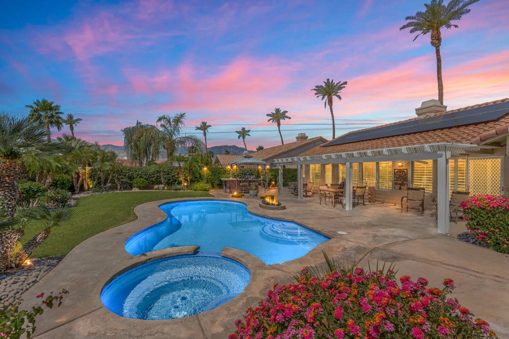 Sophisticated Desert Retreat withPanoramic ViewsNestled in the heart of Palm Desert, thisexceptional 3-bedroom, 2-bath modern homein a gated enclave, offering a beautifulfully remodeled living space, packed withhigh-end upgrades and designer finishes.The custom kitchen is a showstopper,featuring Cambria quartz countertops, anoversized island, lighted glass backsplash,floor-to-ceiling soft-close cabinetry, andupgraded stainless steel appliances. Thespacious layout includes a dual-sidedfireplace, custom shutters throughout, andboth formal and casual living areas.The primary suite is a private haven with aBaroque glass shower wall, dual sinks, aprivate commode area, and a large walk-in. closet. The guest bathroom is equallyrefined, featuring Zebra wood cabinetry, and a tub/shower combination. Both bathroomsinclude lighted mirrors and quartzcountertop surfaces, offering style andfunction in every detail.Step outside to your own desert paradise: a resort-style backyard with a sparkling pool and spa, gas firepit, outdoor kitchen,mature landscaping, and panoramicmountain views--perfect for relaxing orentertaining under the desert sky.Modern upgrades include owner-ownedsolar panels, 3 car garage with EV car plug-in, and a whole-home soft water system, delivering both luxury and efficiency.Homes in this hidden enclave are rarelyavailable--and when they are, they go fast.This is your opportunity to own a one-of-a-kind Palm Desert retreat that truly has it all.