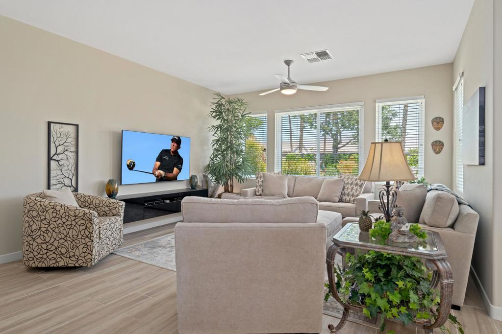 Sun City Palm Desert - Cool Maui Model. Looking for easy desert living and style? This cool and efficient 2-bed, 2-bath Maui model is all about easy desert vibes and smart design, located just around the corner from the Lakeview Fitness Center and Pool. Kick back in your private, oversized backyard with mountain views, zero rear neighbors, and desert-friendly landscaping that's as low-effort as it is good-looking. Inside, the vibe stays fresh with wood-look porcelain tile floors, open-concept layout, new paint and baseboards, room fans, and sleek recently new vinyl windows and sliders. The kitchen serves up stainless steel appliances, tons of cabinet space, and Corian counters--everything you need to whip up something delicious. The primary suite is roomy and relaxing, with a walk-in closet and an ensuite full of light. The second bedroom/den works great as a guest room or a chill home office. Top it off with a unique 2-car garage with built-in storage. You can skip the heavy lifting and just move in as furnishings are available upon request. This low-maintenance home has all the charm and none of the hassle. Come see it today!