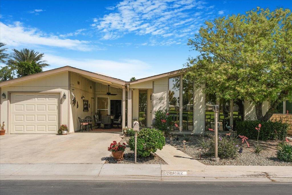 Dont miss out on this Summer Price Reduction! 55+Active Portola Country Club resort home turnkey furnished, garage & pristine 18 hole par3 golf course. Mountain & golf course views are yours from your front patio. Inside you will enjoy the open feeling of cathedral windows & ceilings, luxury laminate flooring and tastefully furnished living areas including the great comfy sectional for watching your favorite channel on the big-screen tv. Your guests will love the new dining-room table & elegant seating. The kitchen has corian counters & dining ell with bar stools. The primary bedroom set includes a beautiful Serta adjustable bed for relaxing nights after a day of pickleball or golf & riding in your red 'Jaguar' golfcart! The ensuite bath has a large dressing room & make-up vanity and there is a separate soaking tub as well as a shower & dual sink vanity in the bathroom. This bedroom has access out sliding doors to the enclosed bonus room for breakfast dining, reading or spending time with your canine or feline pals. The second bedroom has its own ensuite bath offering privacy for your guests. A large laundry room includes sink & plenty of storage. The backyard is totally enclosed which is a great plus if you have a pet and there are plenty of areas in Portola Country Club for walking your dog & meeting all of the other pet-friendly neighbors. This home has a permanent foundation needed for financing. Portola Country Clubs golf & all amenities are included for the owners with one of the deserts most reasonable Assn. fees. AND you OWN YOUR LAND as well. There are pickleball,& bocce ball courts, 3 pools, & this summer we are remodeling our clubhouse with Pub where you can meet new friends & make new memories. Portola Country Club is a 55+community well located near El Paseo shops & restaurants, Pam Desert Aquatic Center & Park, McCallum Theatre and easy access to Eisenhower Hospital & medical facilities. Come see why so many have chosen Portola Country Club for the ultimate Desert Living experience.