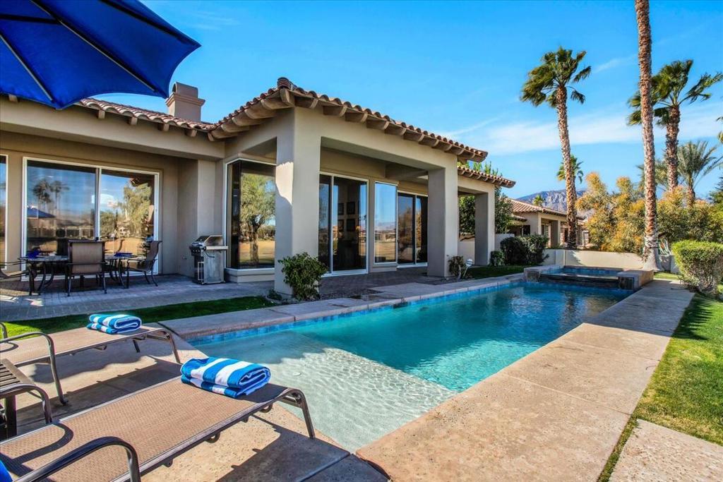 LOWEST PRICE home in prestigious Legacy at Mission Hills and...Turnkey furnished! Lovely 3038sf 4 bed, 4.5 bath home with private casita, situated on an elevated lot overlooking the 17th fairway of the Mission Hills North Gary Player Signature course. Adore the cozy entry courtyard with fire table and fountain, providing access to the casita, guest bedroom and main entry. Enjoy the partially covered patio, pool, spa, golf course & mountain views from the living room, family room and primary suite. Love the high ceilings, tall sliding doors and windows offering abundant natural light for seamless indoor/outdoor living. Appreciate features including: 4 ensuite baths plus powder room, inviting fireplace, wet bar, beautifully updated tile floors throughout, Decor and KitchenAid appliances, slab granite countertops, saltwater pool & spa with new salt cell & panel, new 75 gallon hot water heater, newly painted home exterior, newly painted 2 car + cart garage with new polymer coated floor and side yard lemon tree 'orchard'. The Rancho Mirage location offers quick access to casinos, dining, movies, shopping, I-10 and more... this home truly provides delightful year-round living and fantastic entertaining. Legacy homeownership includes Social-Fitness membership at Mission Hills country club with...no Land Lease. Your new desert home awaits!!