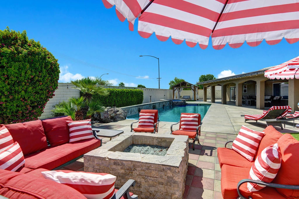 If you're looking for a Ready-to-Go Airbnb property, with a successful track record, and all the amenities needed to entertain large groups for short-term rentals, look no further! This rental property is on an over-sized corner lot, and is being sold fully furnished, turnkey, with absolutely everything you need to continue operating the day after you close escrow. Special features include a billiards table and an attached casita with a full kitchen that yields room to sleep 10+ in total throughout the home. Located in Villa Montego, with excellent proximity to the Coachella and StageCoach Festival grounds, this home checks every box an investor wants to ensure happy guests leave 5 star reviews and pay ''top-dollar'' for their rental stay. There's also a Walmart and Walgreens right around the corner, what more could you need?! While the interior has been decorated with modern and relaxing boho-chic decor, the real attention getter is the expansive backyard designed for every type of entertainment you seek. Including a pebble-tec pool and spa, the exterior of the home boasts a fountain, private cabana, numerous seating areas, large grass lawn for lounging, fragrant citrus trees and ample RV parking. The large covered patio ensures every guest has shade when they need it in the desert heat. This home is the ultimate venue for gatherings and serene getaways alike. Don't let this opportunity to cash-flow immediately, slip away!