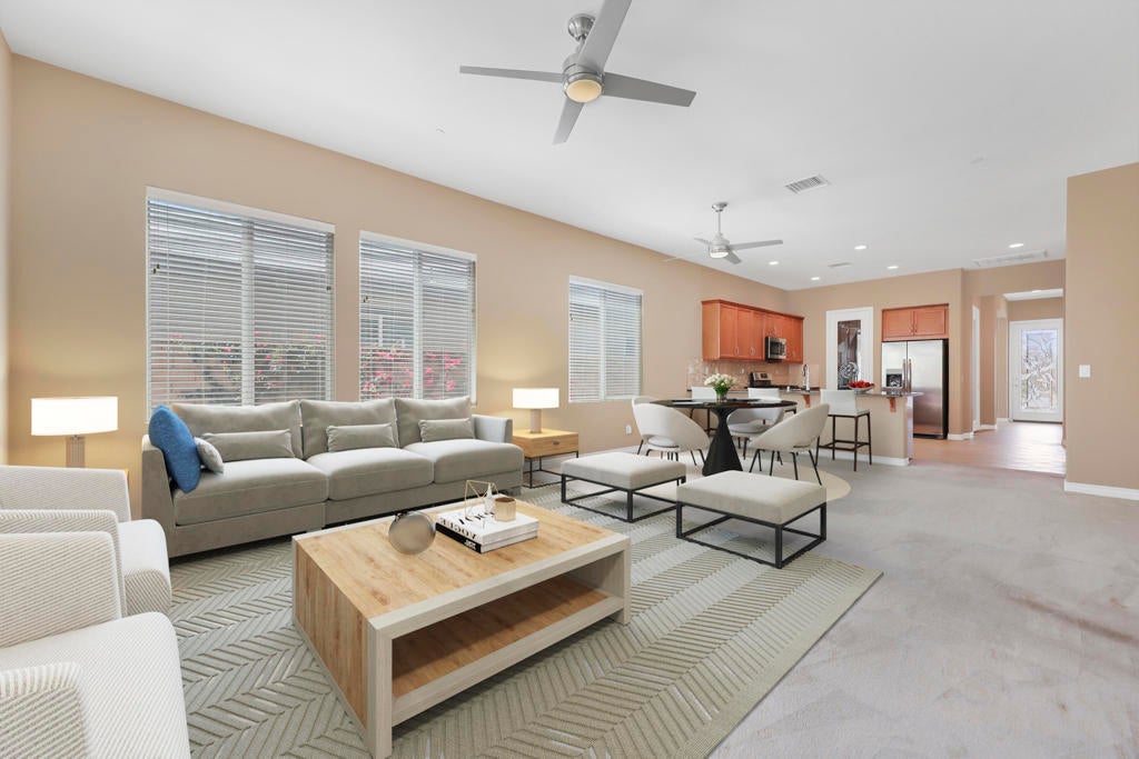 This well maintained home offers a unique opportunity for luxury living in Terra Lago's highly desirable Four Seasons 55+ community. Situated on a private lot, this home boasts excellent curb appeal, highlighted by a custom glass front door and a bright, open interior filled with natural light from large windows. The chef's kitchen is a true highlight, featuring granite countertops, a spacious center island, elegant cabinetry with abundant storage, bar seating, stainless steel appliances, and a walk-in pantry with a custom glass door. This space seamlessly flows into the dining and living areas, creating an ideal environment for everyday living and entertaining. The generous den offers flexible space for various uses, whether a home office, 3rd bedroom, hobby room, or guest area. The primary bedroom suite includes a private bathroom with a full-size walk-in shower. Outside, the private backyard is perfect for relaxation and entertaining. The home also includes a convenient 2-car garage and a separate laundry room with additional storage. Residents of this vibrant community have access to an impressive array of amenities, including The Lodge Clubhouse, a fitness center, indoor and outdoor pools, a spa, bocce ball, tennis, pickleball, and more. With its proximity to local attractions such as championship golf courses and Acrisure Arena, this home truly offers the perfect blend of comfort, luxury, and convenience.