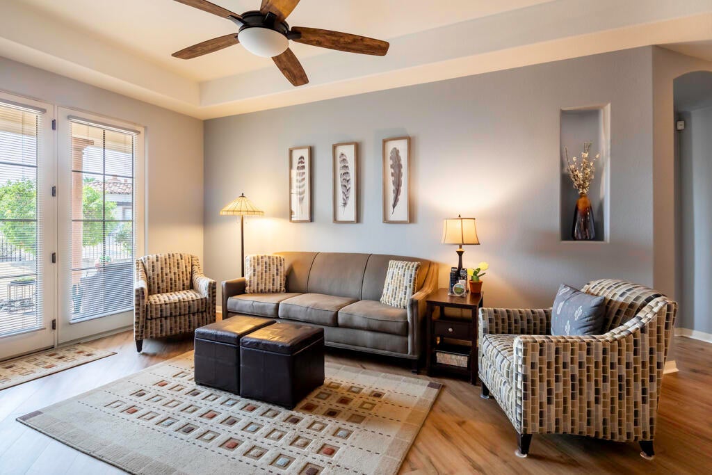 Welcome home to Villa Portofino, the upscale 55+ Active Adult Community in the heart of Palm Desert! This amazing ground floor home offers southern exposure for glorious light-filled living in an open, flowing floor plan consisting of 2 Bedrooms, 2 Baths, + Den/Office, strategically located in the center of the community, providing a tranquil & serene setting. Travertine Tile flooring adorns the kitchen & both baths, while the rest of the home is covered in wood-like flooring, making for a crisp, clean environment. High coffered ceilings, a cozy gas fireplace, & charming glass panel windows & doors for access to the private patio bedecked by lush foliage & desert landscaping. The Cook's Kitchen is adorned in maple cabinetry, slab granite counters, & stainless steel appliances.The bedrooms are located on opposite ends of the condo. The primary suite offers glass paneled windows, sitting area, and large walk-in closet. The primary bath features a dual vanity, slab granite counters, separate travertine tub & shower.The guest room features a quaint window seat & walk-in closet.The guest bath has slab granite counters & travertine shower.The laundry closet features a side-by-side washer & dryer.This gorgeous home is just a short walk to the Clubhouse, Bistro, & large lap pool.Come enjoy the Ultimate Desert Lifestyle in your own Desert Oasis!(HOA Dues Include: Building & Grounds, Cable TV, Internet, Clubhouse, Insurance, Trash, Water.
