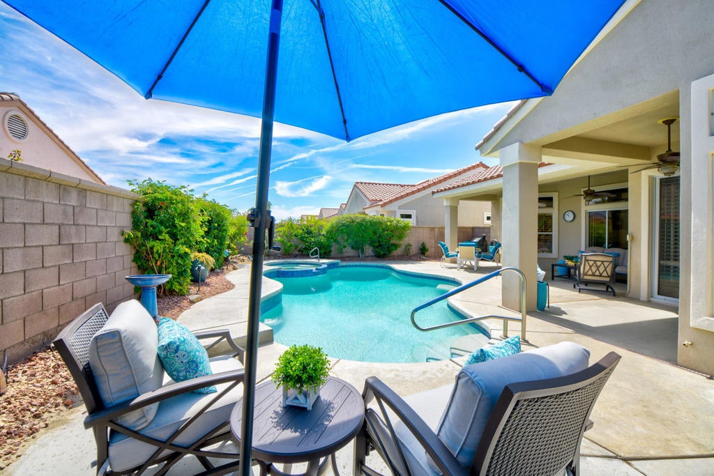 Sun City Palm Desert - 'PAVE' OPEN FLOOR PLAN - LIGHT FILLED! HIGH VAULTED CEILINGS! RENOVATED STUNNING KITCHEN! GORGEOUS POOL/SPA! BEST ACTIVE 55+ COMMUNITY! This is a Must-See 3 Bedroom/2.5 Bath home that has terrific curb appeal with pristine landscape and gated courtyard with artificial turf that looks great year round. Eight-foot double-doors and arched transom window with inlayed decorative glass welcomes you into this bright 2,350 sq ft home. The moment you walk-in be immediately WOW'd by the soaring ceilings in the sizeable Dining and Living Rooms, plus wall of glass that brings the outside in. Family Room includes two walls of windows, an electric fireplace with mantle and connects to the redesigned chef-inspired Kitchen with updated features, style and functionality. Boasting quartz countertops, enlarged eat-in peninsula, stainless steel appliances and under-cabinet lighting, there's a bar/coffee station with glass tile inset in seamless wall quartz backsplash with a built-in wine fridge. Tons of storage and an eating area with two sliders provide views to the oasis-like rear yard. The spacious Primary Bedroom showcases a bay window plus a supersized walk-in custom closet. Ensuite Bath includes dual vanity sinks, soaking tub, new luxury vinyl plank flooring, large walk-in shower with built-in bench. Providing privacy and comfort for visitors are two additional Bedrooms on the opposite side of the home, one currently set-up as an Office. Second Bath is between these two rooms and includes a tub with shower. Off the hallway is the Laundry Room with matching LG washer & dryer on pedestals, utility sink, upper & lower storage cabinets, plus the third Bathroom with pedestal sink. Enjoy the indoor-outdoor living experience that flows into the inviting backyard with a recently resurfaced sparkling pool and spa that has new tile and pebble-tec. A wrap-around extended patio cover adds to create a nice entertaining space. 2-Car Garage and Golf Cart Storage has an epoxy floor, dual-zone Lennox HVAC units, HVAC air scrubber, 2.5-Ton A/C mini split unit, LiftMaster garage door openers, water heater recirculating pump & built-in attached storage cabinets. Extra highlights include 2020 installed Rheem A/C compressor, modern ceiling fans, white wood shutters, electrical surge protectors throughout, two Nest Thermostat Systems, Ring camera doorbell, plus much more! Experience this resort-like gem that provides an open-concept for relaxation and recreation!
