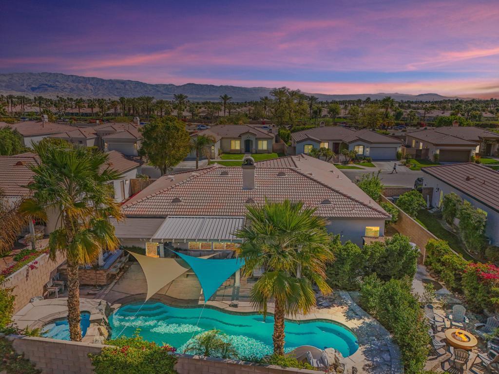 Make an Offer! Experience your own desert oasis behind the gates of desirable Esplanade in North La Quinta. Feel like you are on a permanent vacation in this exceptional home that features 5 bedrooms (one is currently a den but a door can be easily added), 3 bathrooms, and approximately 2,352 square feet of open & airy living space with an enchanting backyard that perfectly captures the essence of desert living. As you enter, you're greeted by a bright and welcoming great room with soaring ceilings, built-ins, cozy fireplace, and poolside views. The spacious kitchen is equipped with granite countertops, stainless steel appliances, a pantry, and counter seating, and opens to a formal dining area with a cozy breakfast nook just off the kitchen. The expansive primary suite opens to the serene backyard oasis through sliding doors. The luxurious remodeled en-suite bathroom feels like a private spa, featuring dual sinks, a vanity, a freestanding soaking tub, an open shower, and a walk-in closet. Step outside to your personal retreat with a cabana and an outdoor shower secluded by a wall of greenery, offering the ultimate in relaxation and tranquility. The 2nd & 3rd bedrooms share a guest bath & 4th bedroom has its own bathroom. The 5th bedroom/den/office offers plenty of versatility. The backyard is a stunning oasis that truly captures the California desert lifestyle, spend sun-filled days by the pool and spa with a waterslide, entertain around the built-in bar with BBQ, unwind beneath the pergola with misters, or gather around the lushly secluded fire pit for stargazing and storytelling. Spacious laundry room w/ sink & ample storage, 2 car garage w/ AC, dog run, painted in chic calming tones throughout, ceiling fans & shutters. Centrally located, in the IID for lower cost electricity. Low HOA! Close to IW Tennis Garden, fantastic dining, entertainment, top schools, shopping, world class golf & festivals! Don't miss your chance to make this incredible home yours & live the desert lifestyle!
