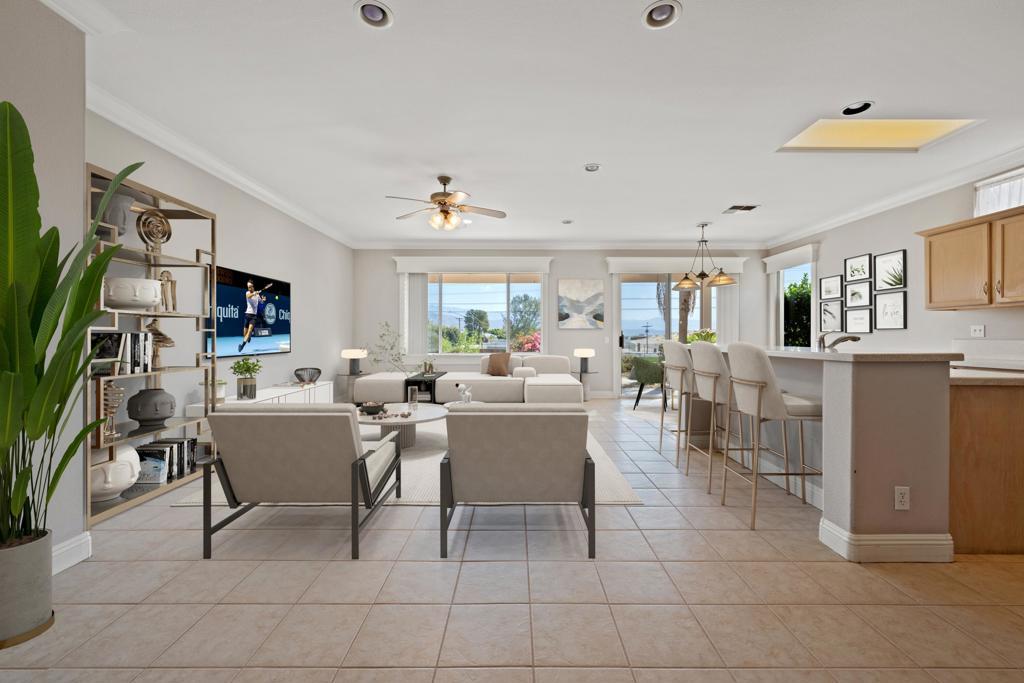 Sun City Palm Desert - Cayman. This popular great room home sits over a lush greenbelt. Enjoy panoramic mountain views from the east facing rear yard that features a spacious patio with alumawood patio cover and low maintenance desert landscaping with panoramic golf course and Mountain View. Inside, tile flooring is in all but the bedrooms and den. Crown molding is in the greatroom and den. The kitchen features extensive cabinetry, an island with breakfast bar and corian counters. Off the greatroom is a spacious den/office. The primary suite has a large walk-in closet with mirrored wardrobe doors. The primary suite bathroom has dual sinks and a stall-shower with glass enclosure. A tub/shower is in the guest bathroom. The guest bedroom also has a closet with mirrored wardrobe doors. Laundry is located inside the house. The 2-car garage has space for plenty of storage. AC new 2017.