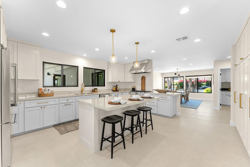 Experience resort style living at La Quinta Country Club's Golf Estates. Welcome to your dream home, perfectly situated on the 14th fairway of the prestigious LQCC. This fully renovated 3 bedroom, 3.5 bath residence offers 3,373 sq. ft. of luxurious living space, complete with sweeping golf course and mountain views. Inside, a brand new chefs kitchen awaits, featuring top of the line Thermador stainless steel appliances, custom cabinetry and high end finishes...ideal for everyday living and effortless entertaining. The open concept layout flows seamlessly into the spacious family room with a cozy fireplace and elegant dining area, all filled with natural light and designed to highlight the home's serene surroundings. A sunken formal living room adds character and warmth with its own fireplace, a separate wet bar...perfect for hosting or unwinding in style. The expansive primary suite offers a peaceful retreat with a spa inspired bathroom showcasing a large walk in shower with designer tile and a generous walk in closet. Two additional bedrooms provide privacy and comfort...one with an ensuite bath and walk in closet, the other with a beautiful bath just across the hall. Step outside in to your private oasis: a sparkling pool and spa, multiple patios, a built in fire pit and even a Green Egg grill. Whether you're entertaining or enjoying a quiet desert evening under the stars, this outdoor space is your personal sanctuary. All of this located in one of La Quinta's most desirable communities, just minutes away from Old Town La Quinta, the legendary La Quinta Resort with fine dining and boutique shopping and the world renowned Indian Wells Tennis Garden.