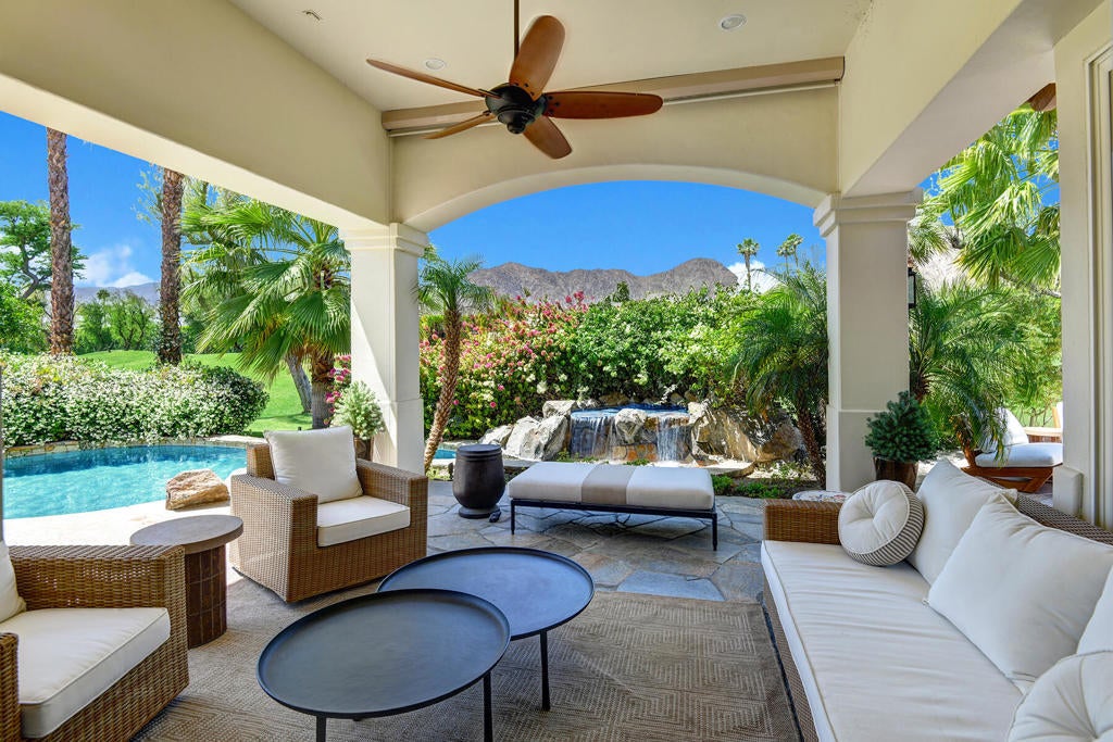 The word ''stunning'' doesn't effectively capture the vibrance and beauty of the interior and exterior renovations completed last year in this rare Hacienda II floorplan, located off the green of the 5th hole on the Jones Course. With breathtaking Panoramic Views of the Santa Rosa Mountains, located at the end of the cul-de-sac, and featuring 4 bedrooms, 4.5 bathrooms (including a renovated detached casita) the home rests on a premium lot with ample outdoor space for multiple seating areas, lush privacy amongst the citrus trees, and water features to add a relaxing calmness while enjoying the outside. The list of upgrades in this home includes: newly painted interior, new carpeting/tile flooring through the home, new vanities, new fixtures and new toilets. The side patio was fully renovated to accomodate a quaint seating area, next to high-quality shaded space with artificial grass for kids or pets to play in. The kitchen was completely re-imagined with new countertops, single-slab quartzite kitchen island, freshly painted cabinets and a new refridgerator. The formal dining room boasts a chic, custom bookcase built to compliment the oversized wine fridge wall across the table. New custom blinds along the interior and exterior of the home, as well as all new exterior lighting, round out a lengthy list of enhancements. Do not miss out on this one-of-a-kind home in one of the most stunning communities the city of La Quinta has to offer!