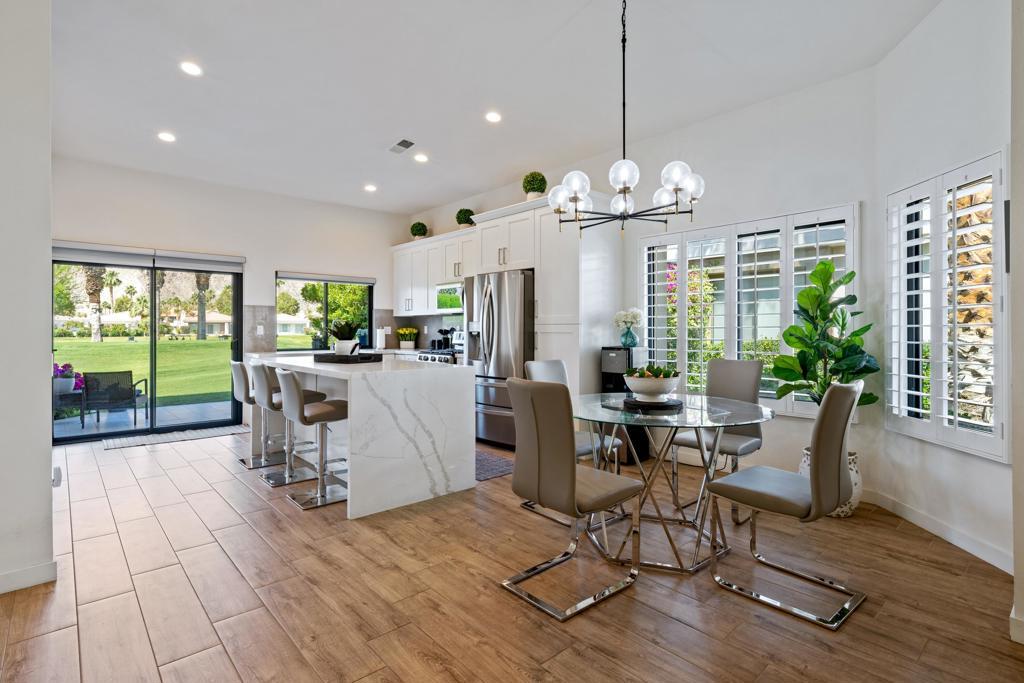 This highly desirable Champion 4 floor plan offers an open-concept layout with approximately 1,918 square feet of beautifully updated living space, including 3 bedrooms and 3 bathrooms.Located within the prestigious PGA West Palmer Gate community, this home captures stunning west-facing views of the Santa Rosa Mountains and the Palmer Private Golf Course. The spacious great room features a cozy fireplace, built-in wet bar, and expansive windows that flood the interior with natural light while framing breathtaking, unobstructed views of the course and mountains. Enjoy spectacular sunsets and the enchanting glow of the mountains each evening.The remodeled kitchen boasts quartz countertops, new stainless steel appliances, and updated cabinetry--perfect for any home chef. Throughout the home, you'll find new windows and doors, tile flooring, and modern finishes in every room.The master suite includes direct patio access and a peaceful view enhanced by a well-placed shade tree, while all bathrooms have been tastefully updated to reflect the home's contemporary style.A sliding glass door opens to a tiled front courtyard, ideal for barbecuing and outdoor dining. Just steps away, enjoy community amenities such as a sparkling pool and spa, all within a 24-hour gated community offering the best of the PGA West lifestyle