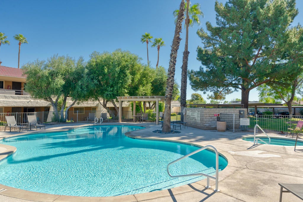 Welcome to this beautifully updated one-bedroom condo offering comfort and convenience. The open living space is perfect for relaxing or entertaining, complemented by an updated tidy kitchen. The renovated bathroom adds a touch of luxury with walk in tiled shower and new finishes and fixtures. As well, a new efficient AC will add to your comfort! Palm Springs Villas offers resort style living with onsite tennis courts, swimming pools and pet friendly green spaces. Ideally located minutes to Palm Springs for world class shopping, restaurants, and entertainment. This move-in-ready home is perfect for first-time buyers, downsizers, or investors.