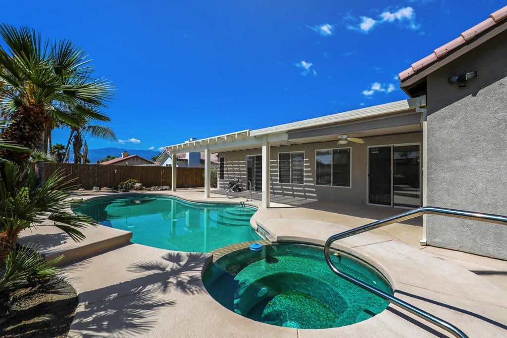 Situated on a desirable corner lot with desert landscaping and an extended driveway, this stylish home offers a warm welcome and smart layout. A covered walkway leads to the front entry. Inside, you're greeted by a spacious living room with vaulted ceilings and a wall of windows viewing the backyard and sparkling pool and spa. A formal dining area--formerly the fourth bedroom could also be used as an office or a fourth bedroom.The open-concept kitchen and family room feature a cozy fireplace, a center island, black granite countertops, and stainless-steel appliances, pull out drawers in the cabinets, including a gas range, microwave, large sink, and refrigerator with ice maker. 4 large windows offer excellent light. Freshly painted walls and recent repairs reflect the home's well-maintained condition.The split bedroom floor plan provides ideal privacy. The primary suite with vaulted ceiling is located to the right of the entry and includes direct access to the pool/spa and backyard retreat. The hall near the kitchen leads to a Full Bath and Two guest bedrooms that share a versatile open space--perfect for a TV lounge, study area, or home school setup.Conveniently located in the hall near the Primary is a laundry area and access to a deep two-car garage with utility sink and built-in storage. The backyard is designed for relaxation and entertaining, with low-maintenance landscaping and a long, covered patio--partially solid for shaded dining and partially slatted for filtered light. Enjoy stunning views of the South Mountains while dining al fresco. A storage shed adds extra utility, and the split-zone HVAC system ensures year-round comfort. Near Eisenhower Health main campus, Desert Willows Golf Resort. 3 Grocery stores, restaurants and the I-10 on ramp nearby on Monterey or Cook Street. This is an excellent centrally located neighborhood with No HOA dues and in the desert hub.
