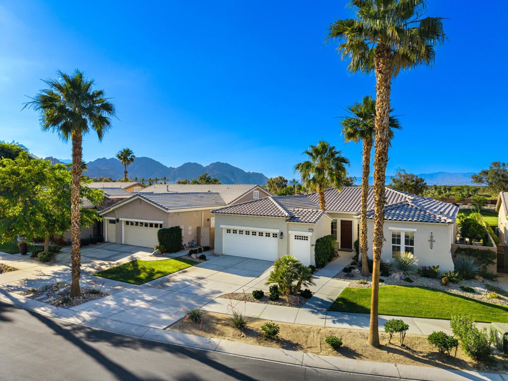 Located off the 9th fairway of The Golf Club at La Quinta. Discover your private desert oasis with this stunning move-in ready home with spectacular pool, spa and breathtaking panoramic mountain views. This impressive Cassius plan offers a great room floorplan with 2,164 sq. ft. of living space, 2 bedrooms and a versatile private den/office that can serve as a 3rd bedroom. New luxury vinyl flooring and painted white cabinetry throughout. The gourmet kitchen boasts stainless steel appliances, and new double convection ovens with air fryer feature. Under cabinet lighting, glass tile backsplash and a walk-in pantry. The large center island has plenty of seating along with the spacious and bright breakfast area offering incredible views. The great room is light and airy with picturesque sliding glass doors and full glass windows that showcase the amazing views.The formal dining room opens to the great room adding to the incredible entertaining spaces this home offers. The primary suite with amazing views, features a large glass shower with shelf, 2 separate vanities, a walk-in closet and a private patio door accessing your covered patio, pool and spa. The guest room suite features a spacious vanity and a newly remodeled walk-in shower with fameless glass and door. The outdoor living space is perfect for entertaining with an expansive covered patio for al fresco dining, enhanced with remote controlled fans, cooling misters and a Sunsitter retractable awning keeping you cool and comfortable all summer long. Relax on your sun loungers or grill at the BBQ station. Swim in your sparkling saltwater pool with cascading waterfall and Caribbean blue mini pebbletec finish or rejuvenate in the tranquil spa. Perfect for fun filled days, enchanting evenings under the stars and unforgettable desert sunsets. The pool is equipped with Pentair's Wi-Fi automation system which controls all the equipment including pumps, pool and spa heater, lights and water feature, remotely for effortless convenience. The spacious two-car garage also features the ''ever popular,'' separate golf cart garage, newer epoxy flooring, air conditioner and overhead storage racks. This is a beautiful home that offers year-round outdoor living along with the beautiful golf course views that provide a stunning backdrop of the majestic mountains. This is resort-style living at its finest!