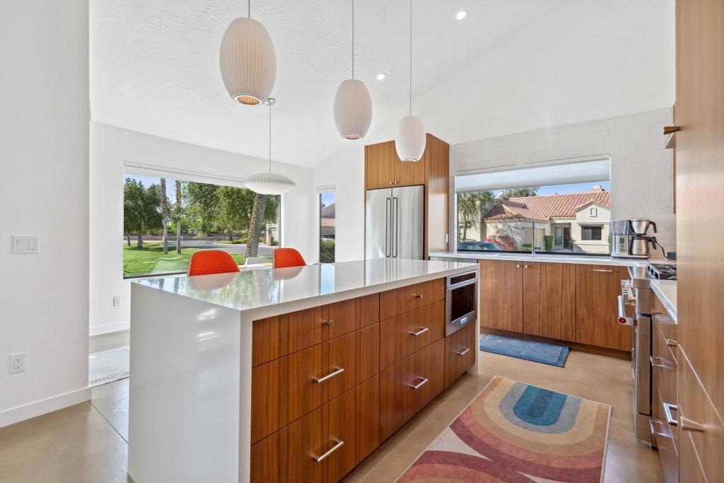 PRICED TO SELL! This absolutely stunning, completely reimagined floor plan (used to be a Classic) in The Resorter is nothing like you've ever seen before! Remodel just completed early 2025 and only occupied for less than 6 months total by current owner! Custom curated from floor to ceiling to be a one-of-a-kind masterpiece, owner spared no expense for perfection, investing well over $200k into this unit. Enter through the front door into the open great room with a vast kitchen and dedicated dining area. The kitchen has custom walnut cabinetry with soft close drawers, white quartz countertops, all KitchenAid appliances, huge stainless-steel sink and designer tile backsplash. The kitchen also has large pantry and pots/pan drawers. All windows and sliders throughout have been replaced with new Milgard windows. Polished concrete flooring throughout keeps the condo cool and very low maintenance. The primary bedroom has a slider to the rear yard, designer barn door into bathroom, and walk in closet with storage. The primary bathroom features floating vanity with double sinks, large storage drawers, bright tile shower with glass doors, Kohler sinks and Toto toilet. The guest room has updated closet doors, direct access to the guest bathroom and is nicely furnished. A guest bath is shared by the common area and guest bedroom which has custom floating vanity, another bright tile shower with glass doors, Kohler sink and Toto toilet. A designer barn door leads to a custom ''mud room'' that houses washer, dryer, extensive storage and leads to finished garage with air conditioner and tankless water heater. Private driveway is also a huge plus! Top-down, bottom-up window coverings in all rooms and blackout shades in both bedrooms. Please see attached, extensive list of work that has been completed along with a full inventory... everything has been replaced and redone! Save yourself time and effort creating the perfect, one-of-a-kind property - this one is done and ready for you!