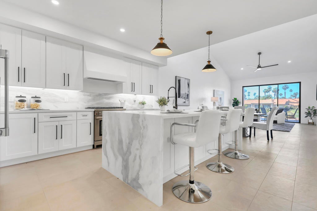 This is the popular Jacaranda Plan - recently remodeled and updated. Plus, it features an all new room addition - totaling three bedroom ensuites. It's located within Palm Valley Country Club. It has breathtaking westerly views of the mountains, fairway, and lake. The floor plan is open and airy, bright and light, with high ceilings and new flooring. The living room has gorgeous views and a beautiful new fireplace with the remote control that features adjustable colors. The completely updated kitchen is gorgeous with modern cabinets, a beautiful island, with seating, quartz counters, and updated stainless steel appliances, which includes a new forno gas range. The primary bedroom is spacious and opens to the patio with gorgeous views. The bathroom features a huge walk-in shower with Pebble flooring, twin sinks, lighted wall mirrors, and a beautiful soaking tub. The two additional ensuite bedrooms, with separate bathrooms, include lighted vanity wall mirrors, new vanities, and sinks. It has a two car garage that's accessible from the private entry courtyard. The interior furnishings are negotiable. There's one of many community pools and spas located just a short walk away. Palm Valley Country Club is a private gated community with two Ted Robinson designed golf courses. The HOA includes a fitness center, security guarded gates, cable TV, internet, exterior paint, roofing, landscaping, and refuge disposal. PVCC Offers offers options available for separate golf membership. This is truly an exceptional Must-See property.