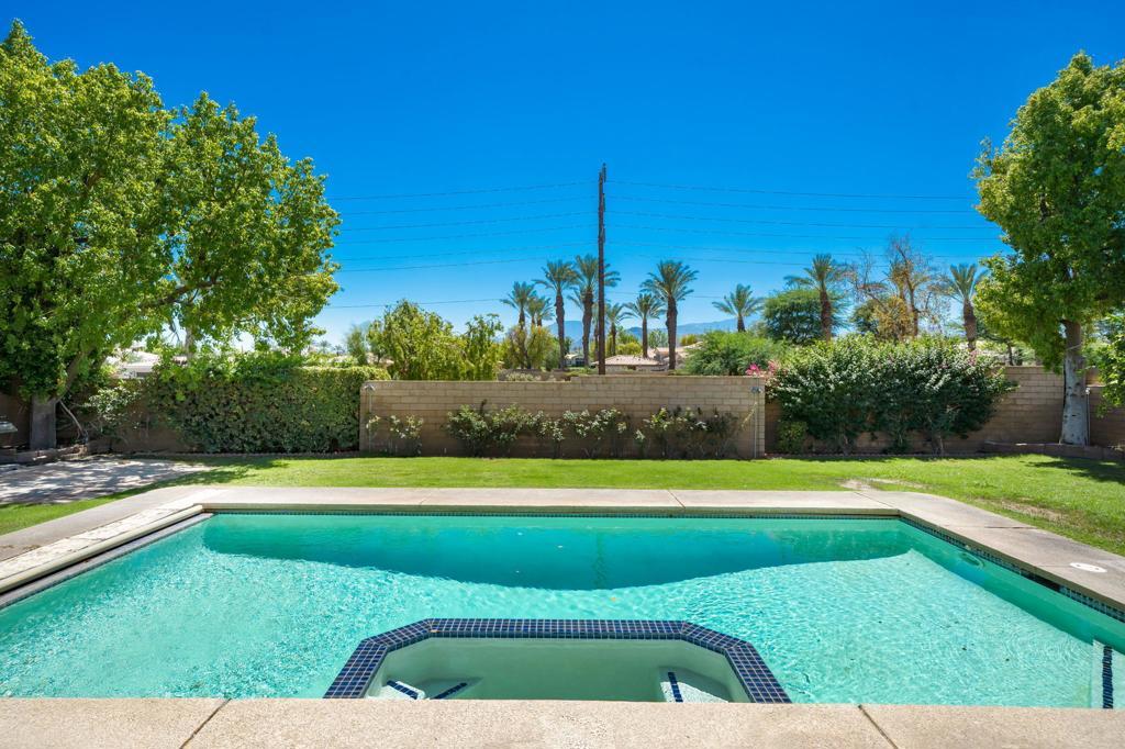 This well-maintained single-family home offers 2,793 square feet of living space with four bedrooms and three and a half bathrooms on. Most homes in Regency Palms are situated on spacious lots, and this one is no exception--set on OVER A QUARTER OF AN ACRE it offers plenty of outdoor space to enjoy. This home has a great layout for families or anyone who wants extra space. The primary bedroom and ensuite bathroom are conveniently located on the MAIN FLOOR, offering added privacy and ease. The open kitchen features stainless steel appliances, a gas stove, and a breakfast nook--perfect for casual meals. There's also a separate formal dining area for hosting friends and family. The primary suite includes a walk-in closet and a large bathroom with double sinks, a separate shower, and a relaxing tub. All bathrooms are equipped with WaterSense fixtures for improved water efficiency.Step outside to enjoy a private backyard with beautiful mountain views, a heated pool, hot tub, and a built-in BBQ area. It's a great space for entertaining or just relaxing outdoors. The home also includes a separate laundry room , central A/C, and a security system. Located in a quiet neighborhood in Palm Desert with great schools around and only 10 mins from El Paseo.