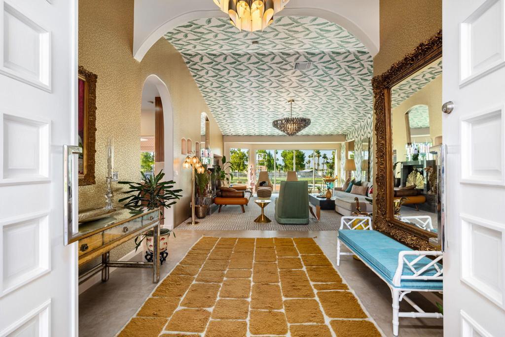 Welcome to The Pink Palace, a glamorous Hollywood-Regency masterpiece where Marrakesh elegance meets Beverly Hills Hotel-inspired sophistication, nestled on a prestigious golf course in South Palm Desert.This designer-owned, fully reimagined 3-bedroom, 3-bathroom residence stuns with breathtaking mountain views from every room, offering a serene backdrop to a lifestyle of opulence. Upon entering, you'll be captivated by vaulted ceilings adorned with wallpaper from the Dorchester Beverly Hills Hotel Collection and custom-designed Karastan carpeting.The home comes fully furnished with a curated collection of vintage art and Restoration Hardware furnishings, creating a timeless aesthetic. Every square inch of this home has been meticulously designed with custom walnut cabinetry and rare emerald and Cristallo quartzite countertops that stun.Abundant natural light floods the interior through all-new Fleetwood sliding glass doors, seamlessly blending indoor and outdoor living. The gourmet kitchen dazzles with new Thermador and Miele appliances.In the backyard, a newly refinished PebbleTec pool with a new heater complements stunning views of the surrounding mountains. A unique feature sets this home apart: a private golf cart entrance to the golf course, unmatched in the area.The primary bedroom is a luxurious sanctuary, featuring a curated art wall and a breathtaking ensuite bathroom. This spa-inspired retreat boasts floating dual vanities clad in exquisite custom quartzite, a spacious separate shower, and an indulgent soaking tub, creating a five-star oasis.Located steps from El Paseo's world-class dining and shopping, with hiking trails and a golf course at your doorstep, this completely reimagined home offers unmatched quality and finishes for hundreds of thousands of dollars less than comparable properties in Indian Wells, Rancho Mirage, and Palm Springs. Seize this rare opportunity to own a turnkey, designer-curated retreat in South Palm Desert's most coveted setting--schedule your private tour today!