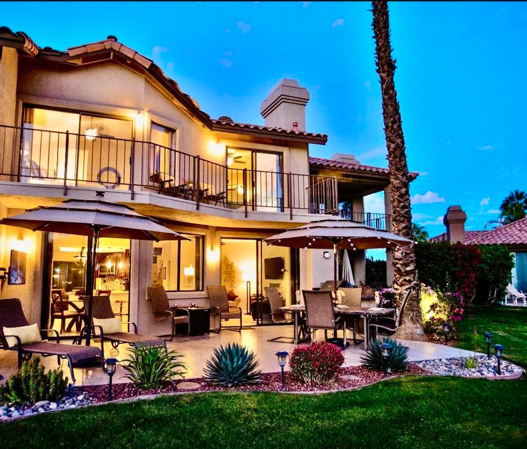 This spectacular 2-bedroom 2.5 bath townhome offers unobstructed 180 views of the San Jacinto and Santa Rosa mountains as well as lake, fairway, and green views on Hole #2 of the Palm Valley CC Challenge Course. This property stands out with sophistication and timeless design. The kitchen has been completely and tastefully updated with soft-closing cabinets, quartz countertops, stunning backsplash, and stainless-steel appliances. The breakfast nook off the kitchen is ideal for an office or reading space. All lighting throughout the home has been updated and enhanced with ceiling fans in the great room and both bedrooms. The contemporary tile flooring is complemented with beautiful baseboards throughout the main floor and extends to the expansive patio where the entertainment begins. You and your guests will enjoy the impressive views while relaxing and dining. The patio boasts a built-in BBQ island, flat screen TV, gas fire pit and retractable awning. Primary and guest bedrooms are located upstairs and share equally stunning views, stepping out to the balcony patio off each suite. The primary bedroom and ensuite is spacious and bright. The guest ensuite is fully remodeled with a newer vanity and tiled shower. New water heater 2023, and new Blink security camera.This home is being offered turnkey-furnished. PVCC features two 18-hole golf courses, 100,000 sf clubhouse with fitness center, 18 lighted tennis courts, 8 pickleball courts, two restaurants, day spa, and resort style pool. There are also 46 pools/spas throughout the club. Short-term rentals are permitted at PVCC which allows this home to be ideal for an investment property. History of Airbnb rental activity available upon request and only a 2 night minimum for short term rentals. Great investment opportunity.
