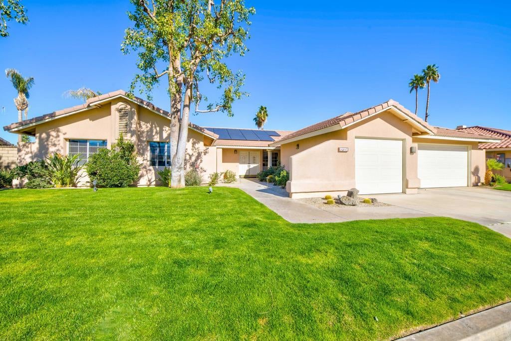 PRICE REDUCTION! Brand new OWNED solar panels just installed with anaphase inverters and a NEW ROOF with 25 year warranty. There are 2 AC units and 4 ductless mini splits one for each bedroom and central HVAC system. This 4 bedroom, 2 bath home nestled within the gated community of Waring Place with LOW HOA DUES steps away from Palm Desert High School and only minutes from the 10 freeway. The new Acrisure arena and Indian Wells Tennis gardens are nearby and only . FHA and VA Loans are welcomed. You can enjoy the beautiful mountain views while relaxing in your salt water lap pool and spa. The electrical panel has been upgraded and a new backyard drainage system has been installed.The primary bedroom is very spacious with an en-suite bathroom, access to the backyard and a walk-in closet. The kitchen and family room are open and great for entertaining or cozy nights by the fireplace. This home is very clean, well cared for and has been upgraded in many areas. The backyard provides ample privacy and there is plenty of space for the whole family plus a 3 car garage with lots of storage and workbench.
