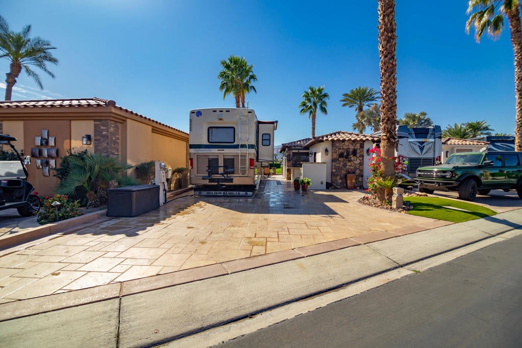 Lot 176, is a premier south-facing, developed golf course lot overlooking the 18th fairway at Motorcoach Country Club in Indio, California. This exceptional property offers unobstructed mountain views and is meticulously designed for comfort, entertainment, and relaxation. The expansive outdoor area features a tile-roof shade structure equipped with three automatic retractable awnings and four drop-down screens for enhanced privacy and sun protection. A built-in gas fireplace and pop-up TV create an inviting atmosphere, while dual-element ceiling heaters and a ceiling fan ensure your comfort. The elegant tray ceilings add a touch of sophistication to this versatile space. The detached casita serves as a private retreat, complete with a Murphy bed, full bath, heating and air conditioning, and an exterior washer and dryer for added convenience. The gourmet outdoor kitchen boasts stainless steel cabinetry, granite countertops, an oversized BBQ, gas burner, two under-counter refrigerators, ice maker, and dishwasher, all sheltered by a retractable awning. This setup is perfect for both casual meals and elegant entertaining. As a resident of Motorcoach Country Club, you'll enjoy access to world-class amenities, including golf, boating, fine dining, and a vibrant social scene. This lot's prime location, stunning views, and top-tier features make it a standout property in this esteemed resort. Motorcoach Country Club exclusively accommodates Class A motorhomes from 30' to 45'. Due to zoning, on-site properties are not considered dwellings, and overnight stays inside them are not allowed. MCC Food & Beverage minimum is $2,080 per year, due October 1st for use during the November-April season. Don't miss this opportunity to own a piece of luxury in one of Indio's most sought-after motorcoach resorts.