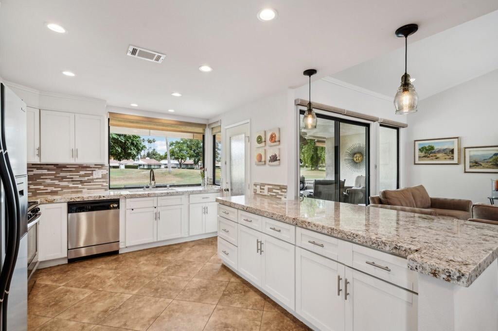 Welcome to this beautifully updated 3 bed, 2 bath 30 Plan offering 1,693 sqft of light-filled living space with sweeping western views of the fairway and mountains. The kitchen has been thoughtfully opened up and features white cabinetry and granite countertops in both the kitchen and bathrooms. The former atrium has been transformed into a versatile space--perfect as an office, bar, or cozy reading nook. This home is offered turnkey furnished, including the furnished extended patio overlooking a wide expanse of the 2nd hole on the North Course, complete with an automatic awning for shade and comfort. Just steps away from a community pool and spa, and part of a vibrant neighborhood with 26 pools and spas. HOA dues cover cable TV, internet, trash, landscaping, exterior painting, 24/7 security, and more. Enjoy around-the-clock access to the community fitness center for a one-time fee of just $25. Don't miss this incredible opportunity to own a move-in-ready home with views, space, and style!