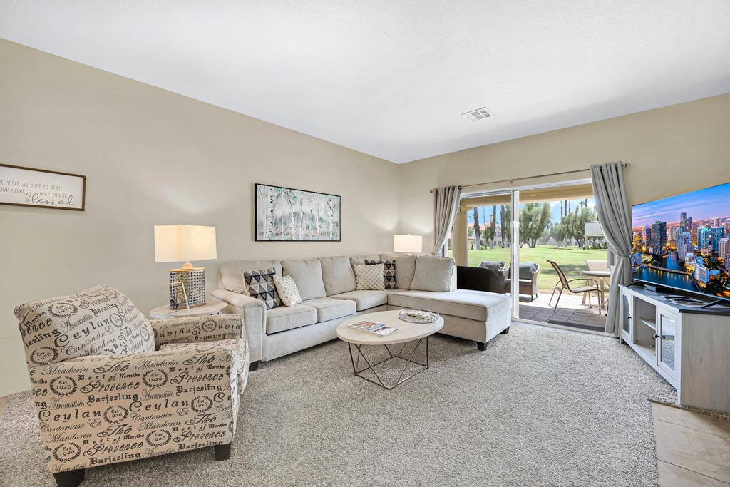 Desert Falls Country Club Gem - Private, Upgraded & Short-Term Rental ReadyNestled within the lush, gated grounds of the prestigious Desert Falls Country Club, this beautifully maintained 2-bedroom, 2-bathroom home offers 1,330 sq. ft. of comfort, style, and privacy. Perfect as a full-time residence, vacation getaway, or income-generating short-term rental (STR-cleared), this property blends relaxation and functionality in a highly desirable Palm Desert community. Furnishings are negotiable, making this home move-in or rental-ready.An extended driveway provides ample parking and a sense of arrival.Thanks to its ground-floor position, the unit stays naturally cooler, especially in summer. Inside, elegant tile flows through the kitchen and dining area, lending a clean, sophisticated air-elegant, durable, and easy to maintain-while plush carpeting in the living and bedrooms adds warmth and comfort.The heart of the home opens to a sun-soaked South-facing patio, partially covered and finished with handsome tiled pavers. The primary suite is a true retreat, offering a spacious layout, a wraparound dual vanity, and a large, tiled shower that feels more like a spa than a bathroom. With additional access from the primary suite, the patio feels like a private sanctuary, with peaceful views and just a few steps to the sparkling pool. Whether you're savoring a morning coffee or enjoying a sunset glass of wine, the surrounding San Jacinto mountains over the pool is the perfect backdrop.HOA Benefits & Amenities at Desert Falls:Beyond the home, Desert Falls offers an exceptional lifestyle. Monthly HOA fees cover high-speed internet, cable TV, landscaping, exterior building maintenance, access to 32 pools and spas, a 24-hour fitness center, 9 tennis courts, 8 pickleball courts, and clubhouse amenities. At its heart lies a multi-level, state-of-the-art fitness center--perched just beside the championship golf club--featuring the latest in cardio, strength training, and group classes. And just outside the gates, you're moments from charming cafes, diverse restaurants, boutique shopping, and trusted pet care services--everything you need for full-time living or vacation ease.Whether you're seeking a private oasis, a vibrant community lifestyle, or a smart investment opportunity, this home checks every box. Welcome to resort-style living at its best! ***Furniture available outside of escrow***