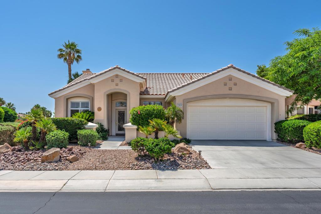Sun City Palm Desert- San Carlos. Located on a spacious corner of lot, a short distance to either the Sunset View or Lakeview Clubhouses, this meticulously maintained home has a beautiful southeast facing rear yard with an extended patio, alumawood patio cover and lush desert landscaping. The corner lot location, front courtyard entry, leaded glass front door and towering foyer provide curb appeal. The home is equipped with dual AC, new in 2022. Inside, 10ft ceilings and shutters are throughout. 18in tile, laid diagonally, is used extensively. The greatroom provide a spacious area for entertaining our relaxing. A spacious family room features a tile trimmed gas fireplace and custom built-in shelving and media center. Off the main hallway, double pocket doors open to a den/office with offset laid tile. The kitchen features corian counters, an expansive breakfast bar, raised-panel maple cabinetry, pendant lighting and stainless appliances. The primary suite has large walk-in closet primary. Its en suite bathroom has dual sinks, a stall shower with glass enclosure, and an oversized tub. A shower/tub and guest bathroom. A utility room has built in cabinet and shelving. The garage has utility sink, built-in and hanging rack storage.