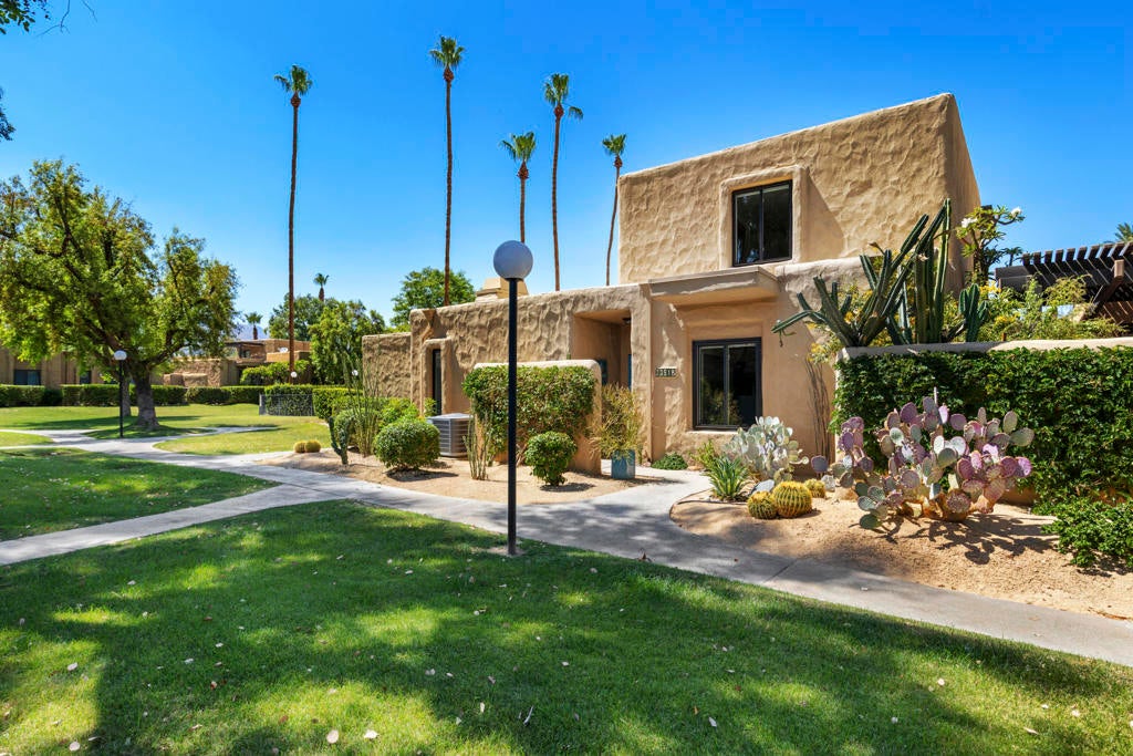 Discover the ultimate in resort-style living with this beautifully maintained 2-bedroom, 2-bath condo, ideally located in the gated and highly sought-after Waverly Park community. Situated on Fee Simple land that you own, this home offers the perfect blend of comfort, convenience, and tranquility.Nestled in a quiet interior setting away from street noise, this residence provides a peaceful retreat while keeping you just minutes from premier golf courses, scenic hiking trails, and the vibrant shopping and dining scene that defines Palm Springs living.Inside, enjoy a thoughtfully updated kitchen with shimmering quartz counter tops and stainless-steel appliances all framed with gleaming high-gloss European cabinetry. Strikingly remodeled bathrooms feature quartz counter tops, custom cabinetry and updated designer fixtures. Sleek tile and wood flooring throughout the main living spaces are on point, and energy-efficient dual-pane windows offer pleasing mountain, and garden views. A private 2-car garage provides direct access into the kitchen, and there is plenty of extra parking just outside on South Birdie Way. Outside, unwind on your private, lushly landscaped patio or take in panoramic mountain views from the private upper-level deck--ideal for relaxing, entertaining, and stargazing. Community features include 3 pools, tennis and pickle ball courts surrounded by meticulously maintained gardens.Lovingly cared for and move-in ready, this home is competitively priced and ready for its next chapter starring you and yours! Don't miss your chance to own a piece of paradise in South Palm Springs!